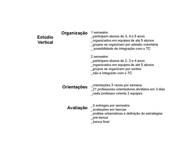 _organizados em equipes de até 5 alunos _grupos se organizam por adesão voluntária _ possibilidade de integração com o TC 2 semestre: _participam alunos de 2, 3 e 4 anos _organizados em equipes de até 5 alunos _grupos se organizam por sorteio _não é integrado com o TC _orientações 3 vezes por semana _21 professores orientadores divididos em 3 dias _cada professor orienta 2 equipes _3 entregas por semestre _avaliações em bancas _análise urbanísticas e definição de estratégias _pré-banca _banca final Organização Orientações Avaliação Estúdio Vertical