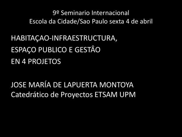 abril HABITAÇAO-INFRAESTRUCTURA, ESPAÇO PUBLICO E GESTÂO EN 4 PROJETOS JOSE MARÍA DE LAPUERTA MONTOYA Catedrático de Proyectos ETSAM UPM