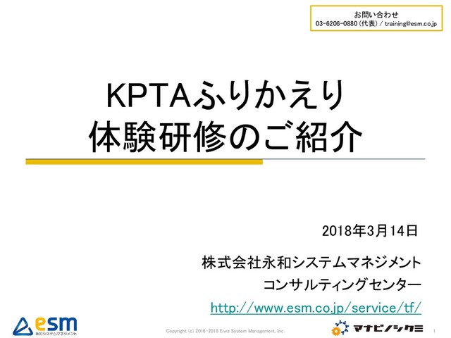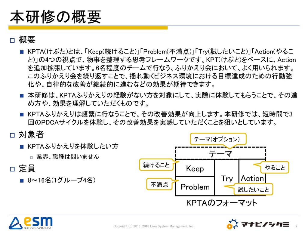 本研修は、KPTAふりかえりの経験がない方を対象にして、実際に体験してもらうことで、その進め方や、効果を理解していただくものです。