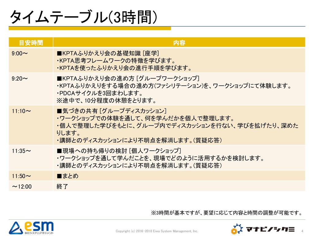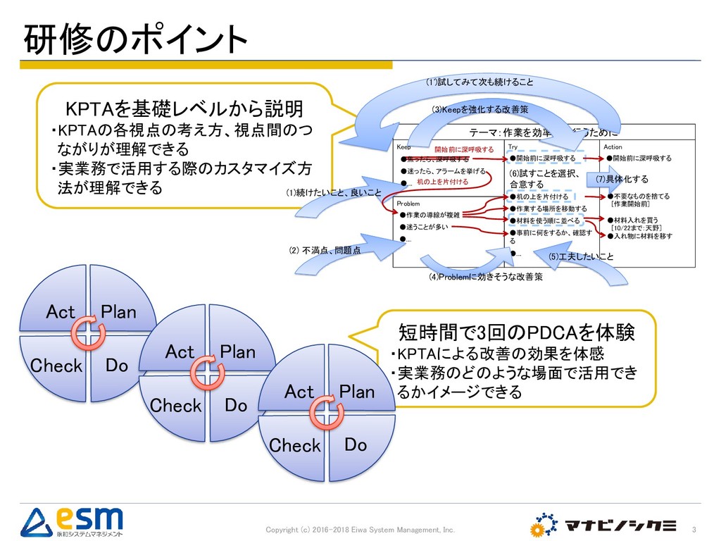 KPTAふりかえりは頻繁に行なうことで、その改善効果が向上します。本研修では、短時間で3回のPDCAサイクルを体験し、その改善効果を実感していただくことを狙いとしています。