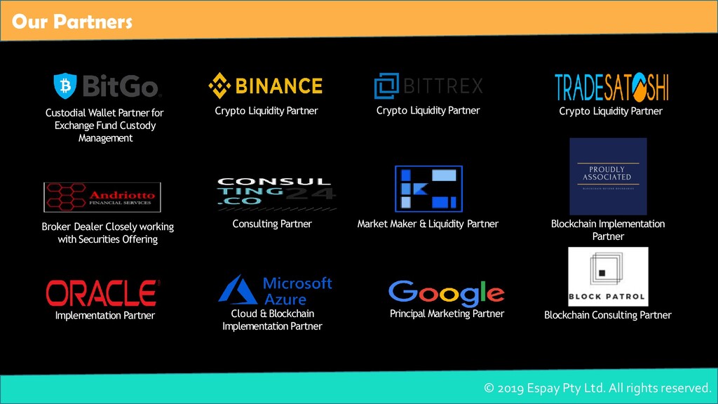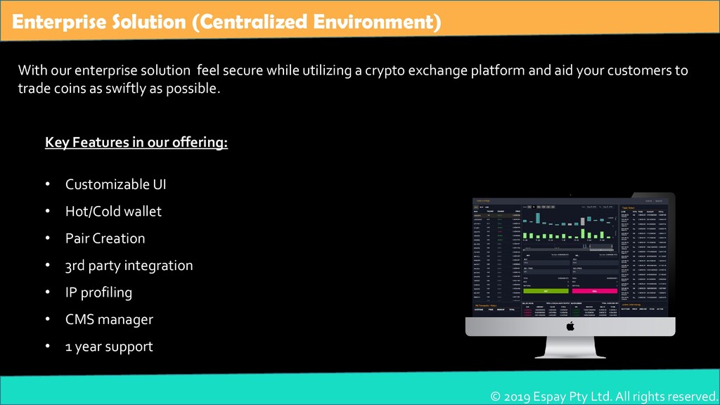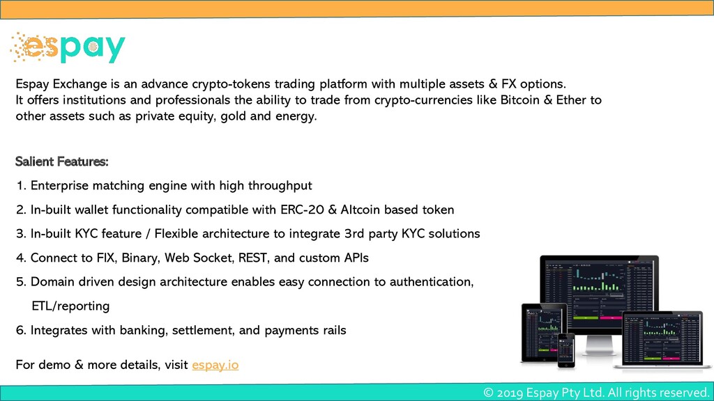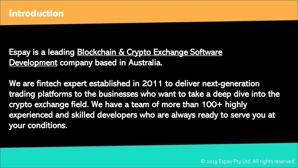 Espay is a leading Blockchain & Crypto Exchange Software Development company based in Australia. We are fintech expert established in 2011 to deliver next-generation trading platforms to the businesses who want to take a deep dive into the crypto exchange field. We have a team of more than 100+ highly experienced and skilled developers who are always ready to serve you at your conditions.