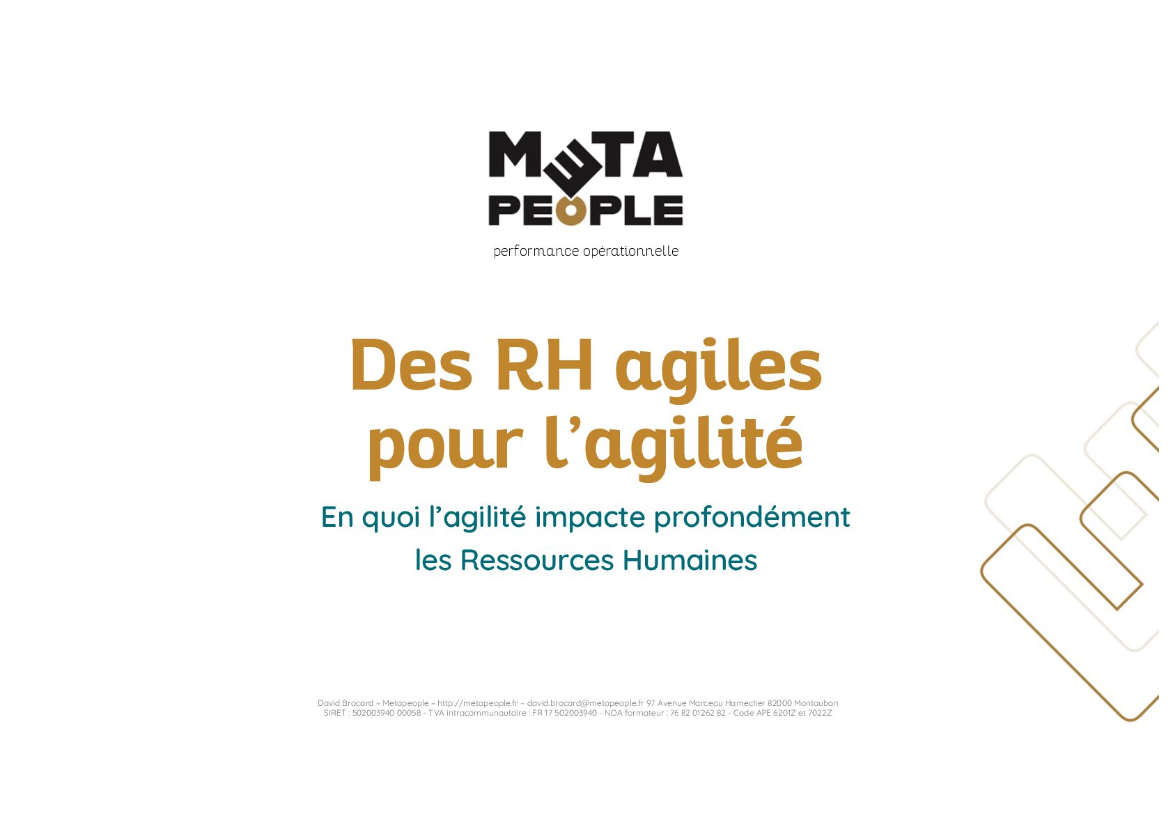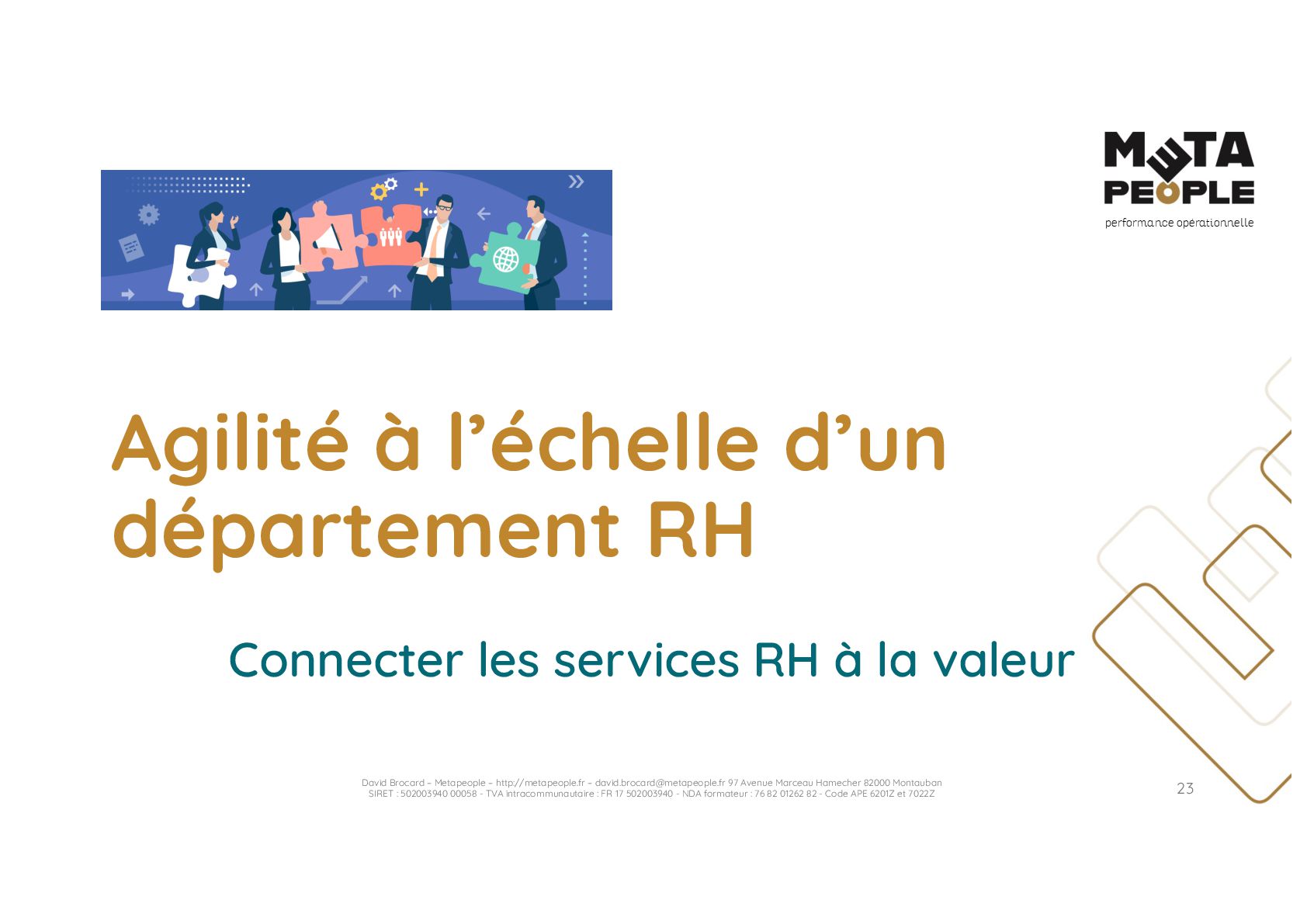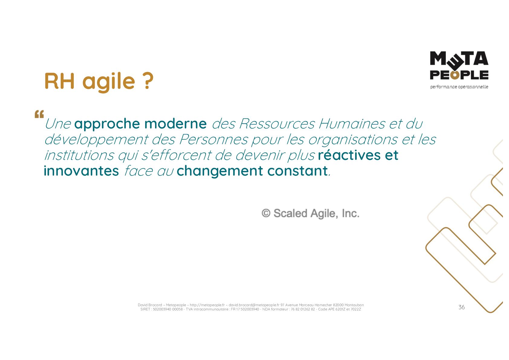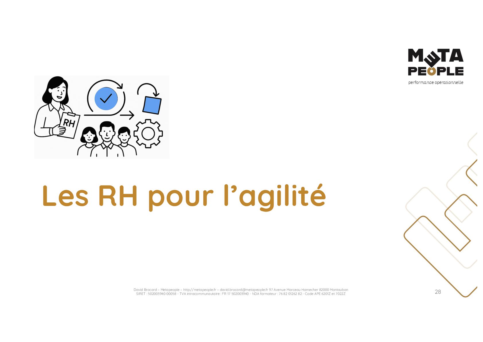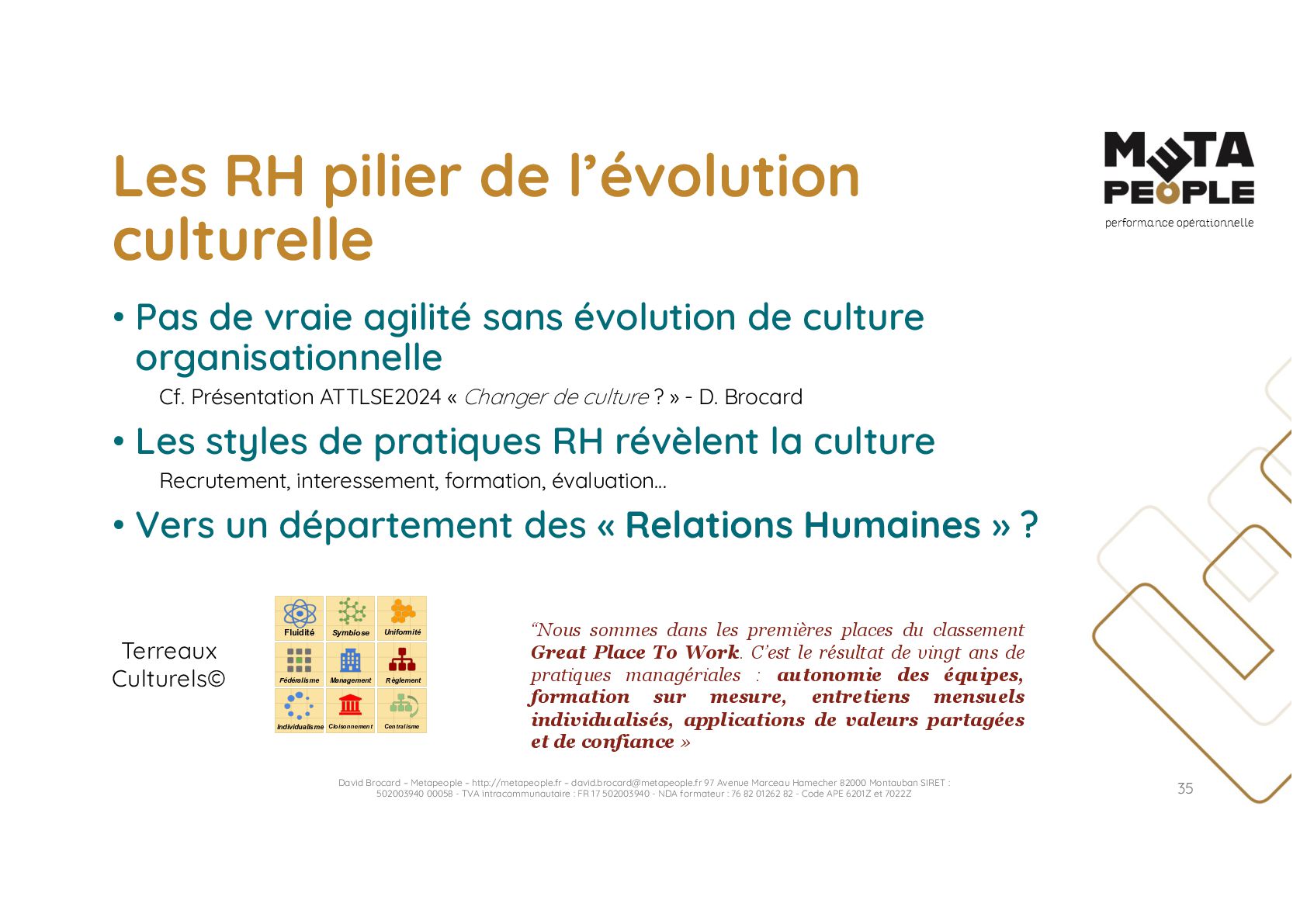de vraie agilité sans évolution de culture organisationnelle Cf. Présentation ATTLSE2024 « Changer de culture ? » - D. Brocard • Les styles de pratiques RH révèlent la culture Recrutement, interessement, formation, évaluation… • Vers un département des « Relations Humaines » ? David Brocard – Metapeople – http://metapeople.fr –