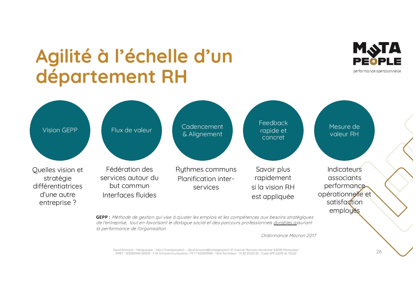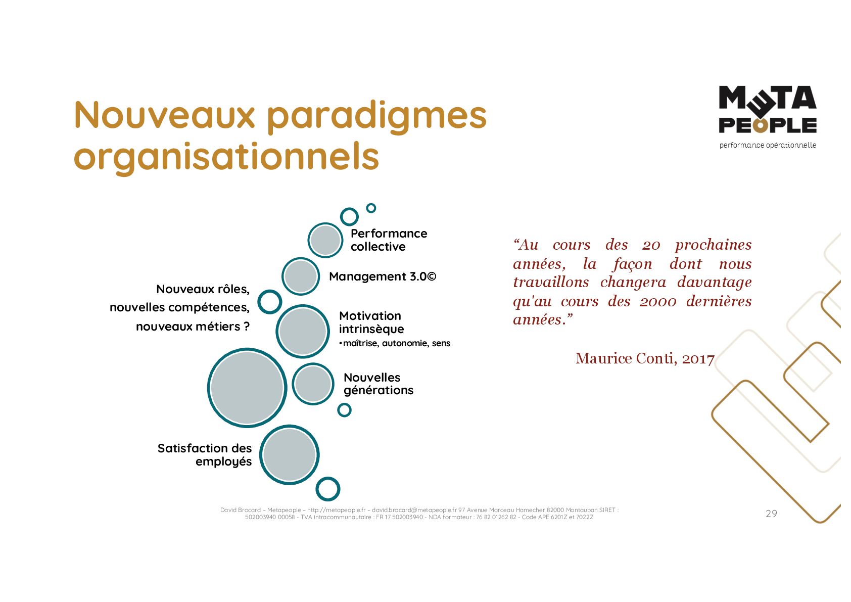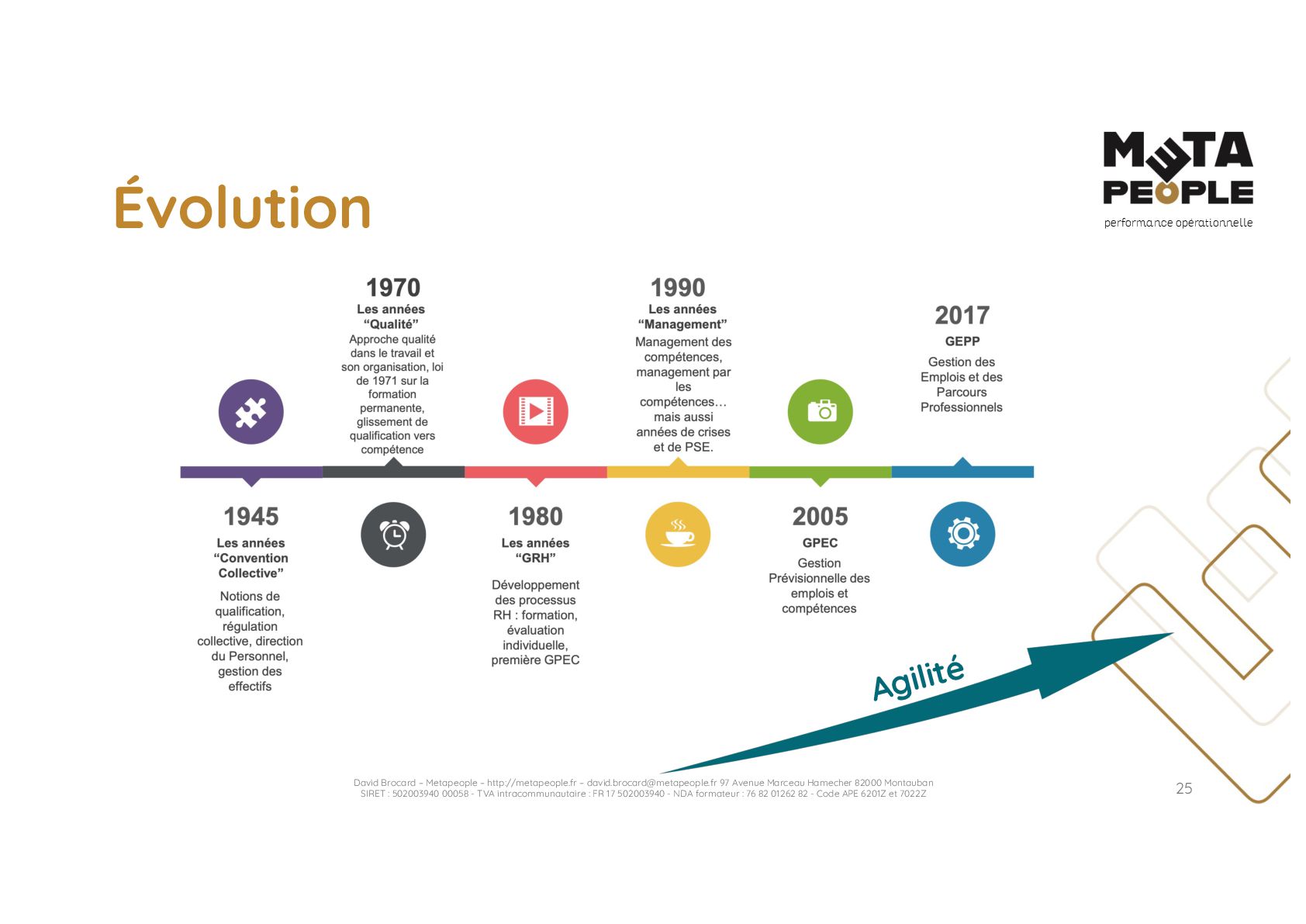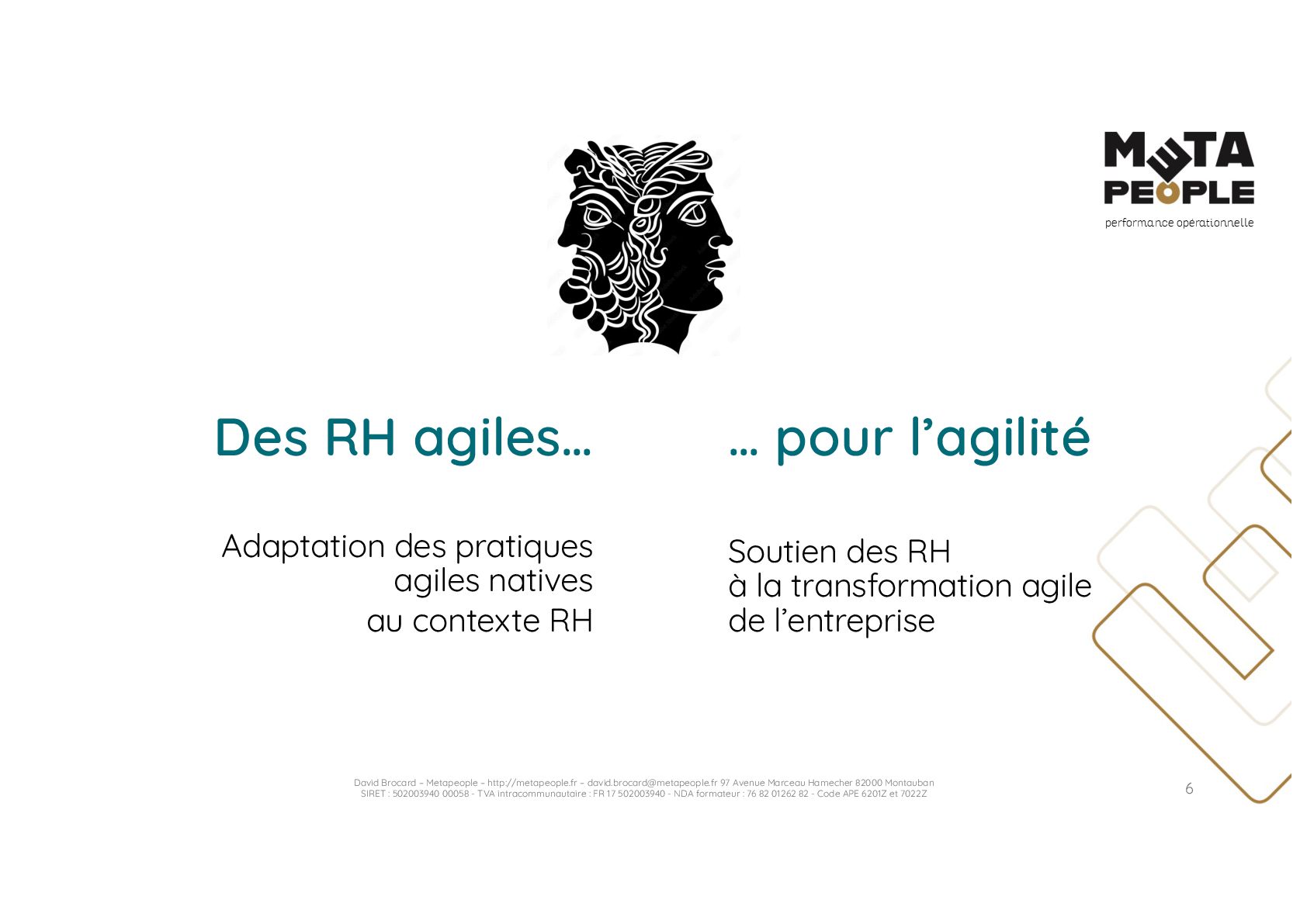 de vraie agilité sans évolution de culture organisationnelle Cf. Présentation ATTLSE2024 « Changer de culture ? » - D. Brocard • Les styles de pratiques RH révèlent la culture Recrutement, interessement, formation, évaluation… • Vers un département des « Relations Humaines » ? David Brocard – Metapeople – http://metapeople.fr –
