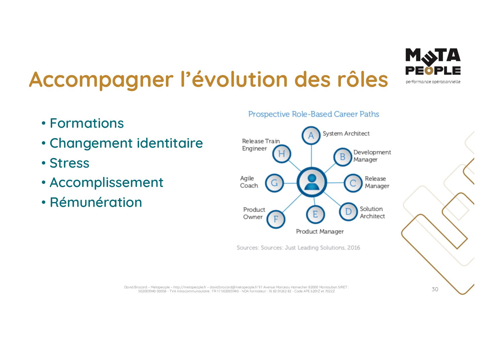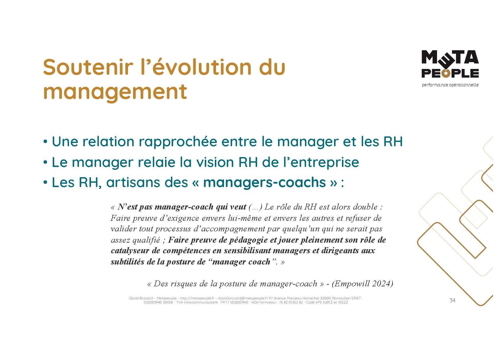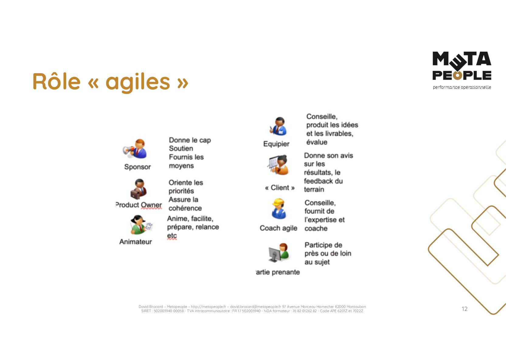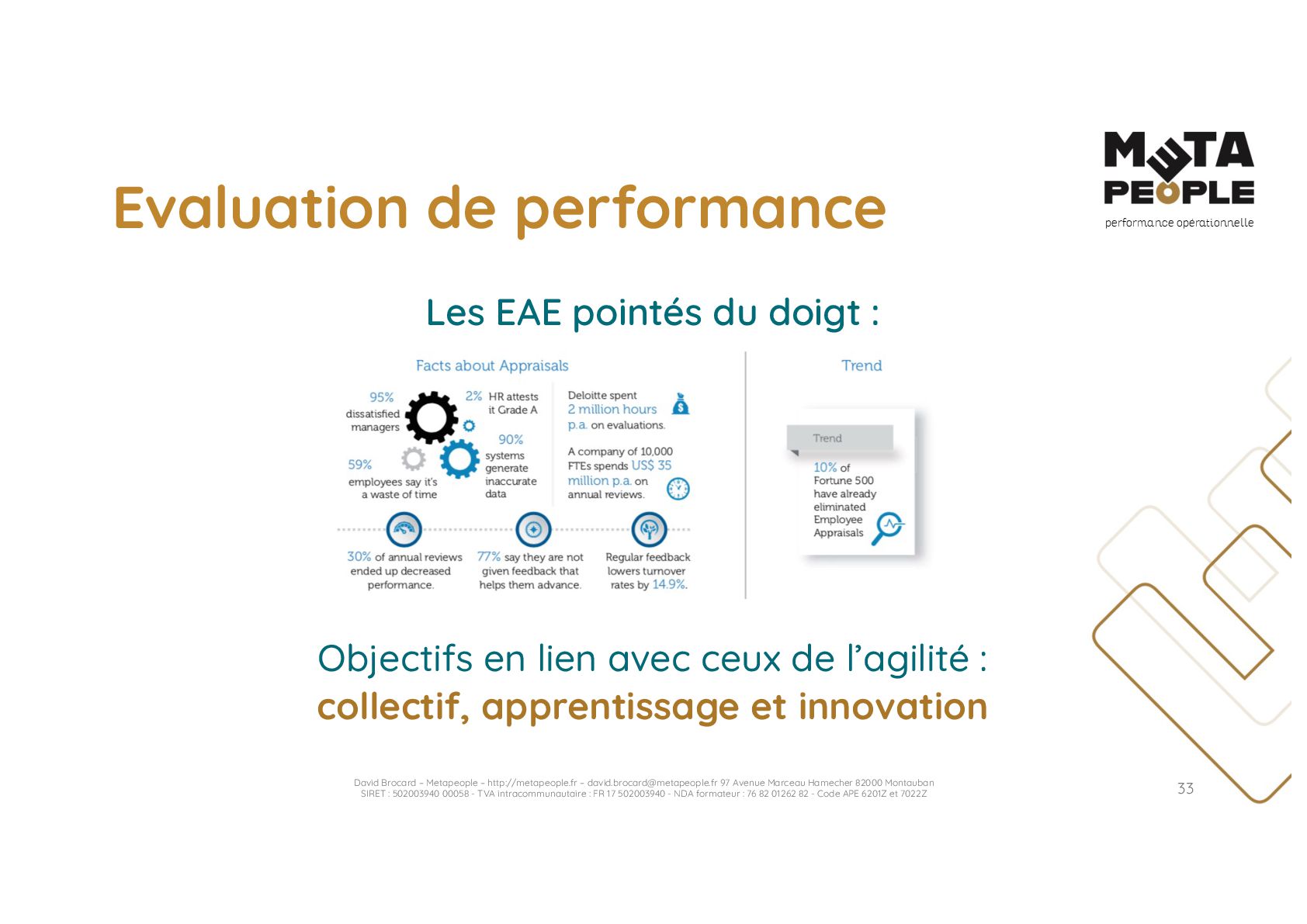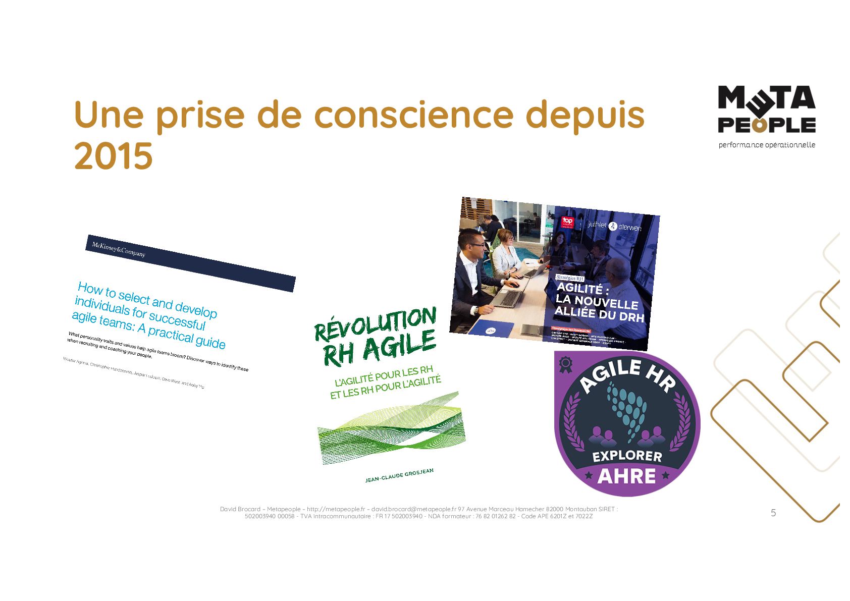 de vraie agilité sans évolution de culture organisationnelle Cf. Présentation ATTLSE2024 « Changer de culture ? » - D. Brocard • Les styles de pratiques RH révèlent la culture Recrutement, interessement, formation, évaluation… • Vers un département des « Relations Humaines » ? David Brocard – Metapeople – http://metapeople.fr –