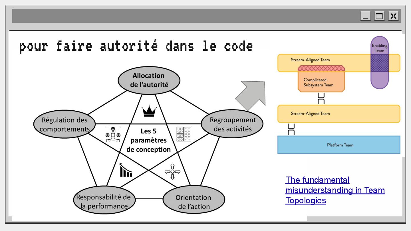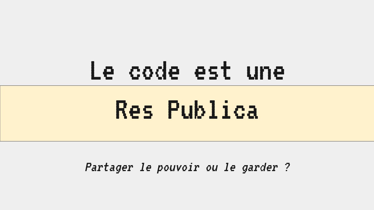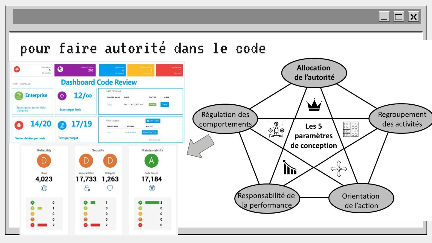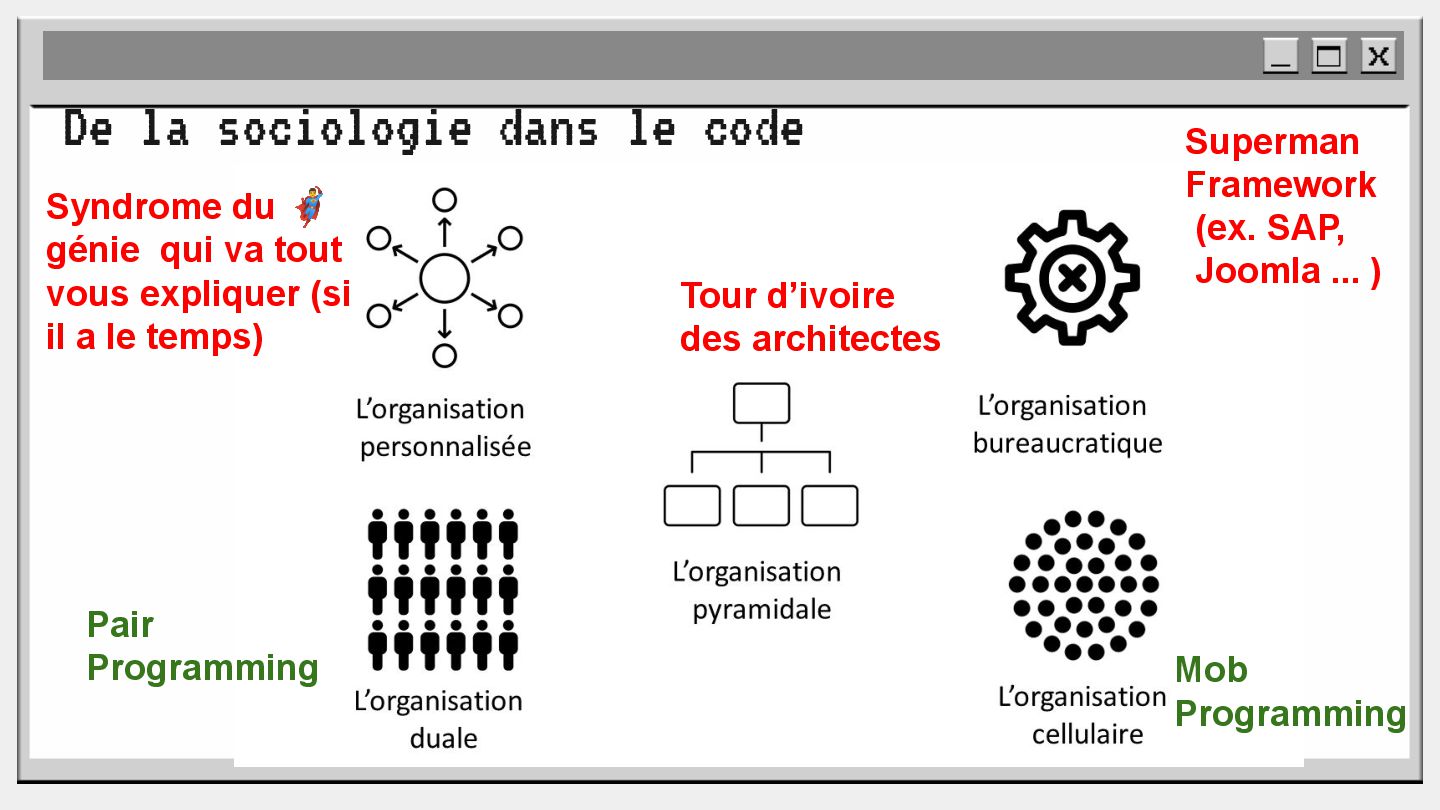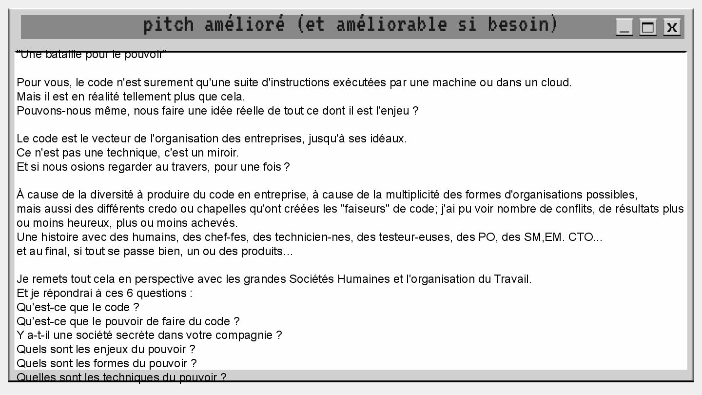 pouvoir" Pour vous, le code n'est surement qu'une suite d'instructions exécutées par une machine ou dans un cloud. Mais il est en réalité tellement plus que cela. Pouvons-nous même, nous faire une idée réelle de tout ce dont il est l'enjeu ? Le code est le vecteur de l'organisation des entreprises, jusqu'à ses idéaux. Ce n'est pas une technique, c'est un miroir. Et si nous osions regarder au travers, pour une fois ? À cause de la diversité à produire du code en entreprise, à cause de la multiplicité des formes d'organisations possibles, mais aussi des différents credo ou chapelles qu'ont créées les "faiseurs" de code; j'ai pu voir nombre de conflits, de résultats plus ou moins heureux, plus ou moins achevés. Une histoire avec des humains, des chef-fes, des technicien-nes, des testeur-euses, des PO, des SM,EM. CTO... et au final, si tout se passe bien, un ou des produits… Je remets tout cela en perspective avec les grandes Sociétés Humaines et l'organisation du Travail. Et je répondrai à ces 6 questions : Qu’est-ce que le code ? Qu’est-ce que le pouvoir de faire du code ? Y a-t-il une société secrète dans votre compagnie ? Quels sont les enjeux du pouvoir ? Quels sont les formes du pouvoir ? Quelles sont les techniques du pouvoir ?