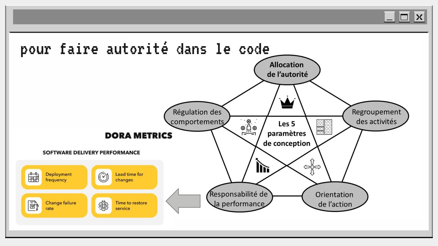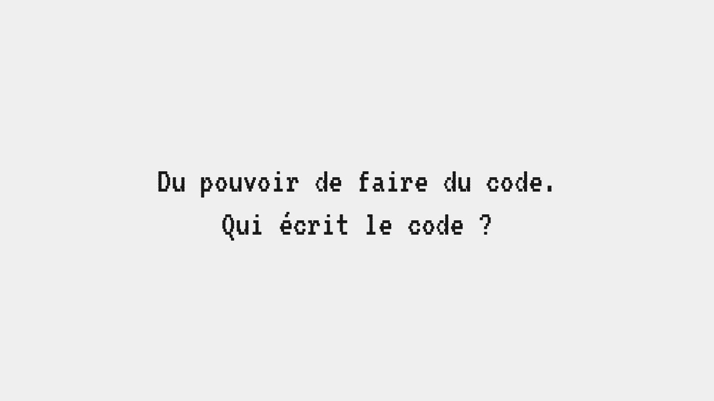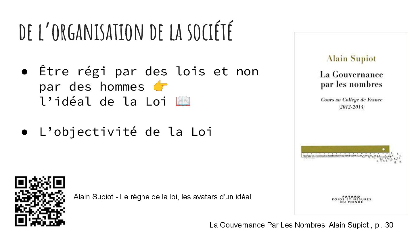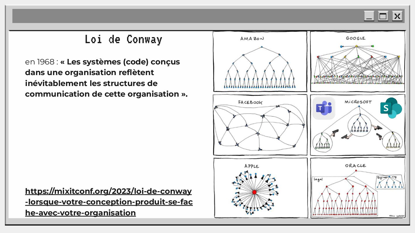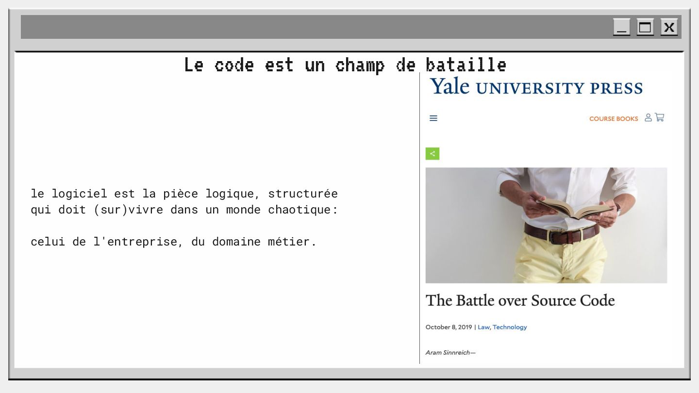 pouvoir" Pour vous, le code n'est surement qu'une suite d'instructions exécutées par une machine ou dans un cloud. Mais il est en réalité tellement plus que cela. Pouvons-nous même, nous faire une idée réelle de tout ce dont il est l'enjeu ? Le code est le vecteur de l'organisation des entreprises, jusqu'à ses idéaux. Ce n'est pas une technique, c'est un miroir. Et si nous osions regarder au travers, pour une fois ? À cause de la diversité à produire du code en entreprise, à cause de la multiplicité des formes d'organisations possibles, mais aussi des différents credo ou chapelles qu'ont créées les "faiseurs" de code; j'ai pu voir nombre de conflits, de résultats plus ou moins heureux, plus ou moins achevés. Une histoire avec des humains, des chef-fes, des technicien-nes, des testeur-euses, des PO, des SM,EM. CTO... et au final, si tout se passe bien, un ou des produits… Je remets tout cela en perspective avec les grandes Sociétés Humaines et l'organisation du Travail. Et je répondrai à ces 6 questions : Qu’est-ce que le code ? Qu’est-ce que le pouvoir de faire du code ? Y a-t-il une société secrète dans votre compagnie ? Quels sont les enjeux du pouvoir ? Quels sont les formes du pouvoir ? Quelles sont les techniques du pouvoir ?