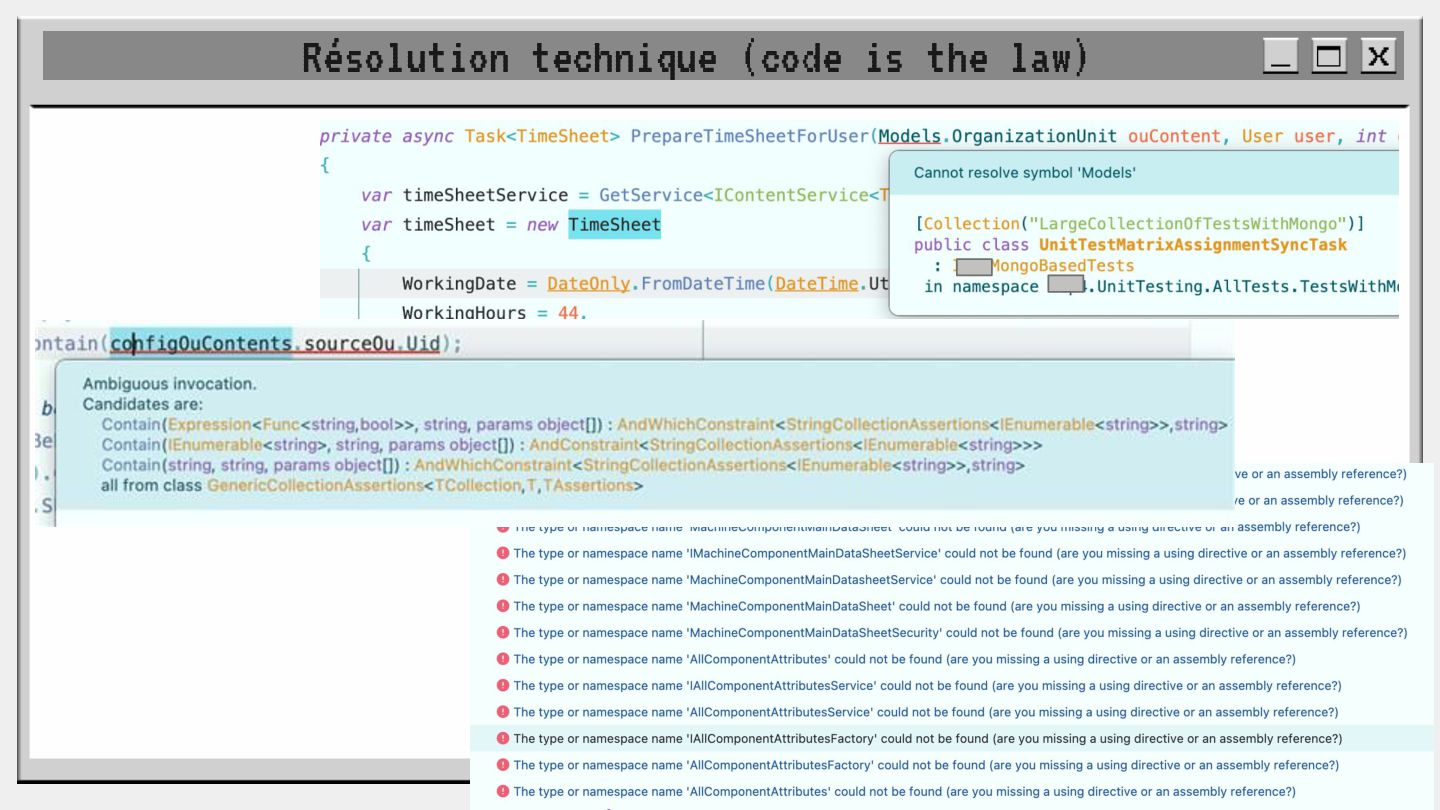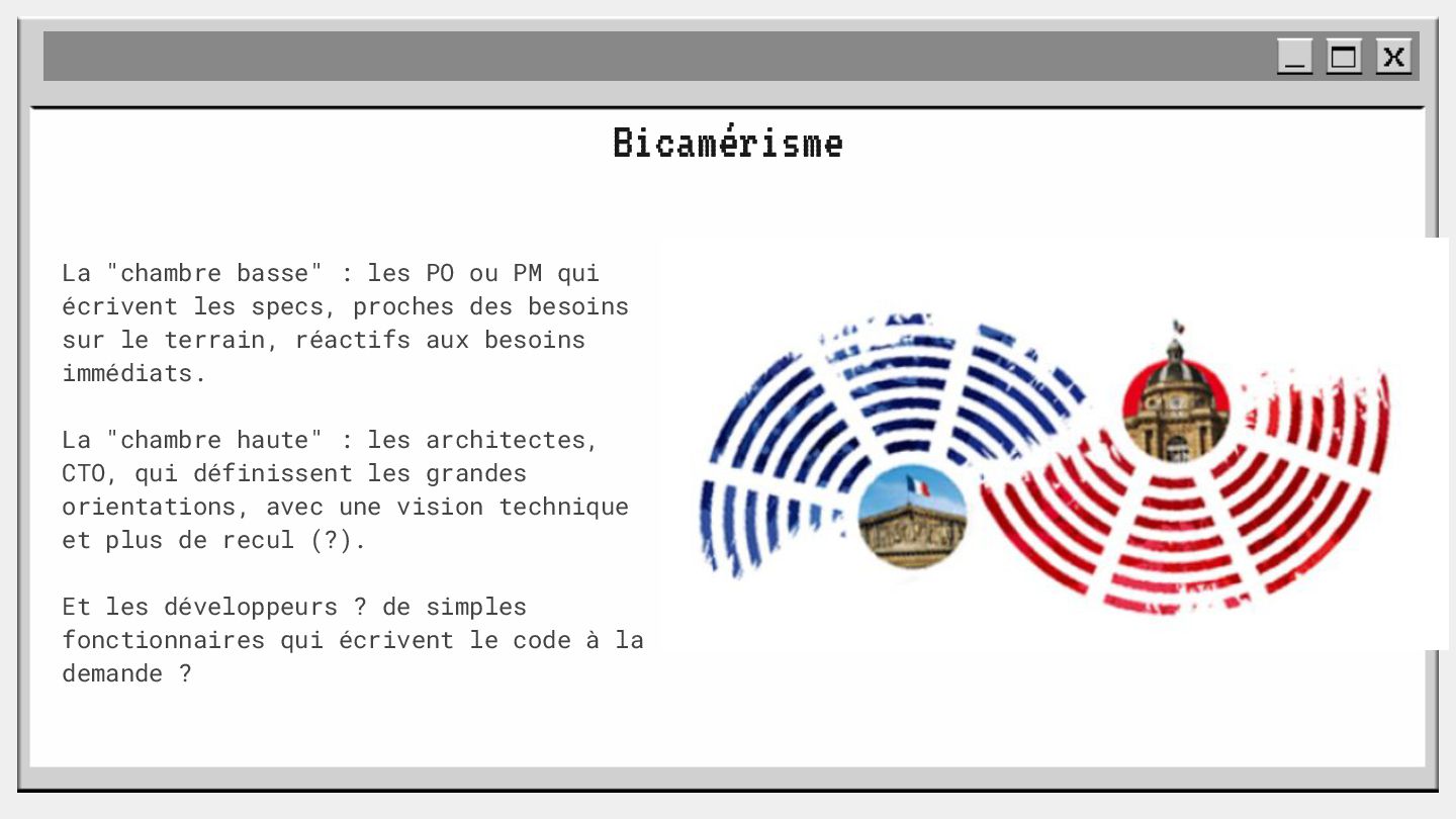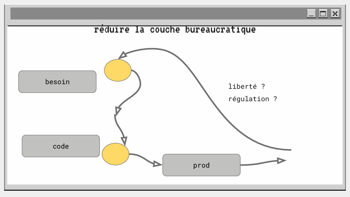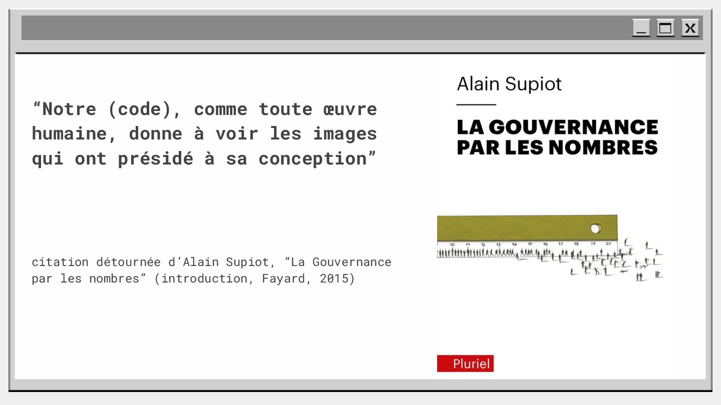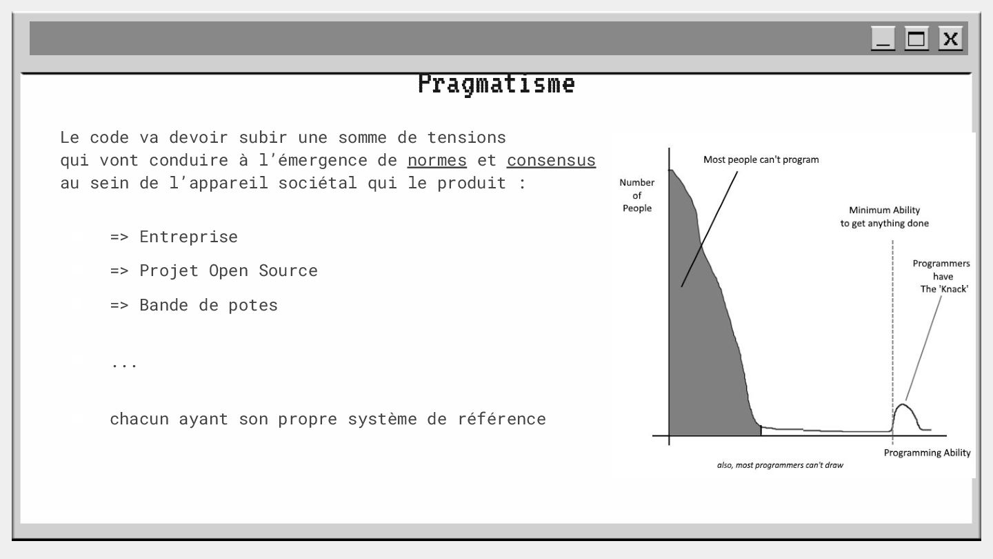 pouvoir" Pour vous, le code n'est surement qu'une suite d'instructions exécutées par une machine ou dans un cloud. Mais il est en réalité tellement plus que cela. Pouvons-nous même, nous faire une idée réelle de tout ce dont il est l'enjeu ? Le code est le vecteur de l'organisation des entreprises, jusqu'à ses idéaux. Ce n'est pas une technique, c'est un miroir. Et si nous osions regarder au travers, pour une fois ? À cause de la diversité à produire du code en entreprise, à cause de la multiplicité des formes d'organisations possibles, mais aussi des différents credo ou chapelles qu'ont créées les "faiseurs" de code; j'ai pu voir nombre de conflits, de résultats plus ou moins heureux, plus ou moins achevés. Une histoire avec des humains, des chef-fes, des technicien-nes, des testeur-euses, des PO, des SM,EM. CTO... et au final, si tout se passe bien, un ou des produits… Je remets tout cela en perspective avec les grandes Sociétés Humaines et l'organisation du Travail. Et je répondrai à ces 6 questions : Qu’est-ce que le code ? Qu’est-ce que le pouvoir de faire du code ? Y a-t-il une société secrète dans votre compagnie ? Quels sont les enjeux du pouvoir ? Quels sont les formes du pouvoir ? Quelles sont les techniques du pouvoir ?