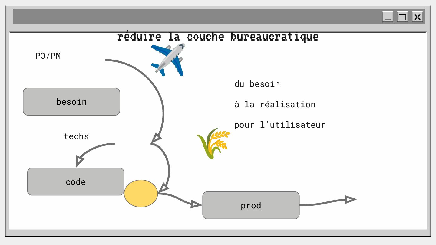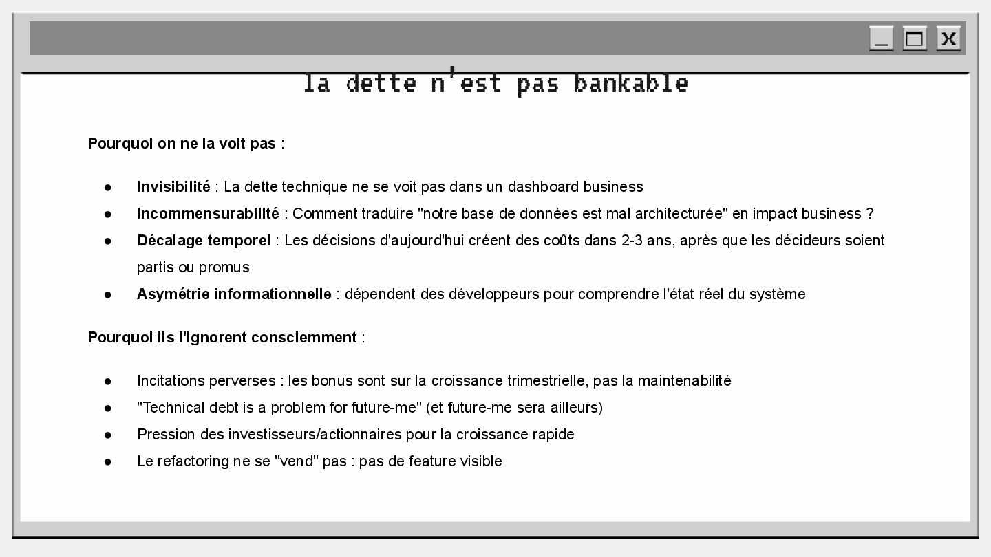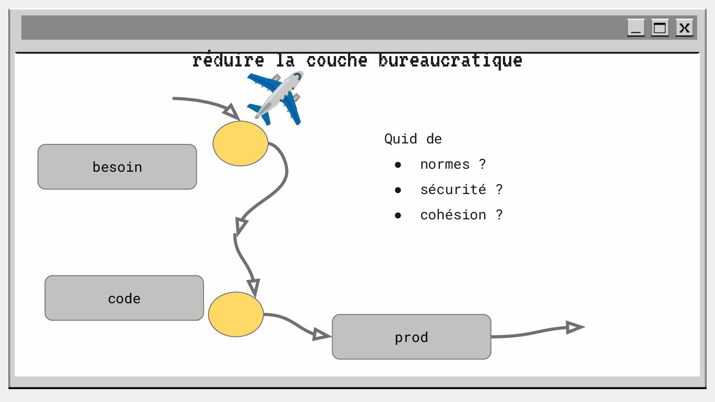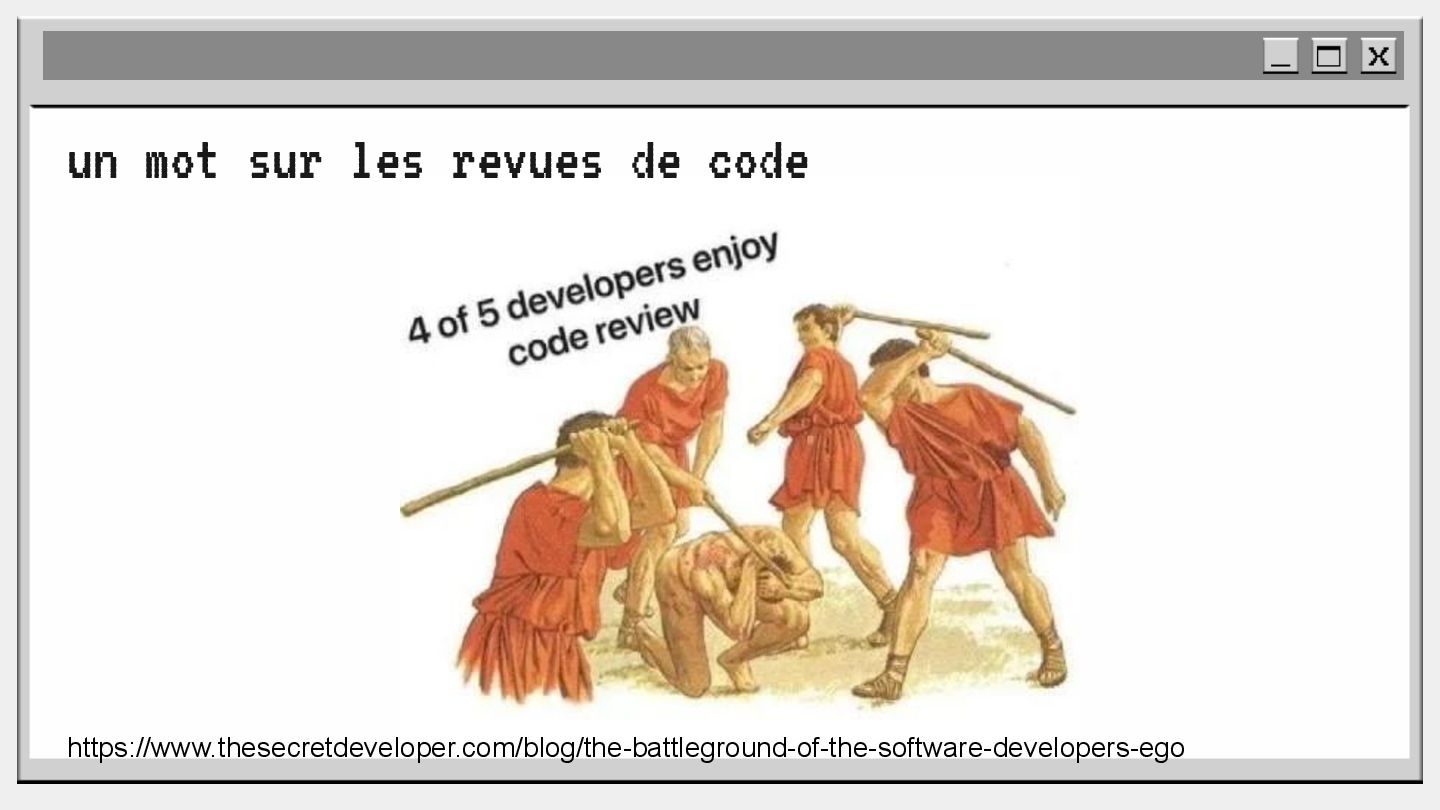 pouvoir" Pour vous, le code n'est surement qu'une suite d'instructions exécutées par une machine ou dans un cloud. Mais il est en réalité tellement plus que cela. Pouvons-nous même, nous faire une idée réelle de tout ce dont il est l'enjeu ? Le code est le vecteur de l'organisation des entreprises, jusqu'à ses idéaux. Ce n'est pas une technique, c'est un miroir. Et si nous osions regarder au travers, pour une fois ? À cause de la diversité à produire du code en entreprise, à cause de la multiplicité des formes d'organisations possibles, mais aussi des différents credo ou chapelles qu'ont créées les "faiseurs" de code; j'ai pu voir nombre de conflits, de résultats plus ou moins heureux, plus ou moins achevés. Une histoire avec des humains, des chef-fes, des technicien-nes, des testeur-euses, des PO, des SM,EM. CTO... et au final, si tout se passe bien, un ou des produits… Je remets tout cela en perspective avec les grandes Sociétés Humaines et l'organisation du Travail. Et je répondrai à ces 6 questions : Qu’est-ce que le code ? Qu’est-ce que le pouvoir de faire du code ? Y a-t-il une société secrète dans votre compagnie ? Quels sont les enjeux du pouvoir ? Quels sont les formes du pouvoir ? Quelles sont les techniques du pouvoir ?