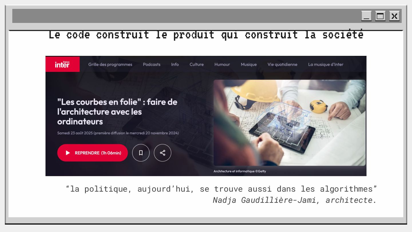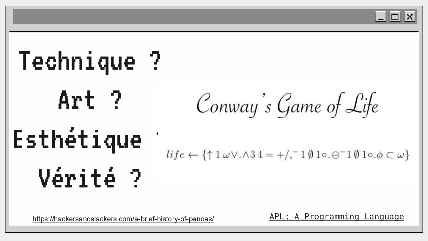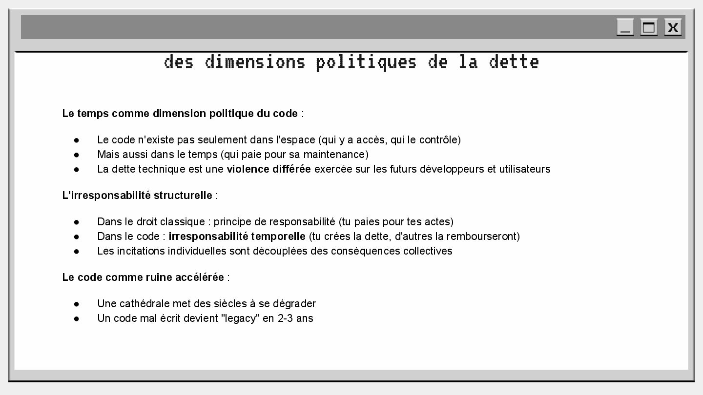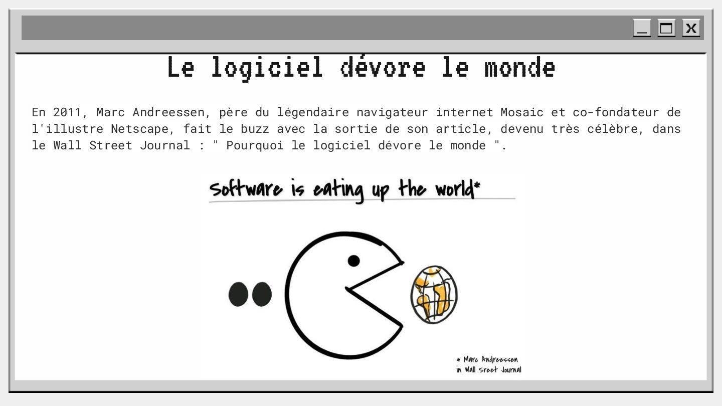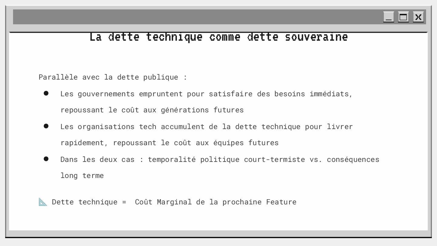 pouvoir" Pour vous, le code n'est surement qu'une suite d'instructions exécutées par une machine ou dans un cloud. Mais il est en réalité tellement plus que cela. Pouvons-nous même, nous faire une idée réelle de tout ce dont il est l'enjeu ? Le code est le vecteur de l'organisation des entreprises, jusqu'à ses idéaux. Ce n'est pas une technique, c'est un miroir. Et si nous osions regarder au travers, pour une fois ? À cause de la diversité à produire du code en entreprise, à cause de la multiplicité des formes d'organisations possibles, mais aussi des différents credo ou chapelles qu'ont créées les "faiseurs" de code; j'ai pu voir nombre de conflits, de résultats plus ou moins heureux, plus ou moins achevés. Une histoire avec des humains, des chef-fes, des technicien-nes, des testeur-euses, des PO, des SM,EM. CTO... et au final, si tout se passe bien, un ou des produits… Je remets tout cela en perspective avec les grandes Sociétés Humaines et l'organisation du Travail. Et je répondrai à ces 6 questions : Qu’est-ce que le code ? Qu’est-ce que le pouvoir de faire du code ? Y a-t-il une société secrète dans votre compagnie ? Quels sont les enjeux du pouvoir ? Quels sont les formes du pouvoir ? Quelles sont les techniques du pouvoir ?