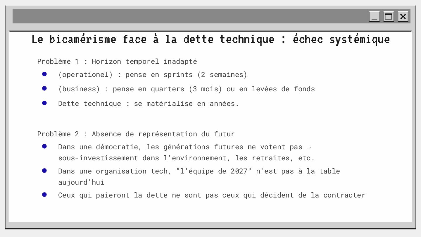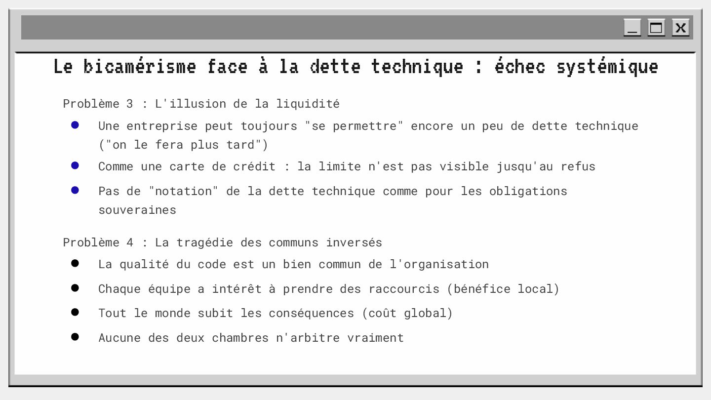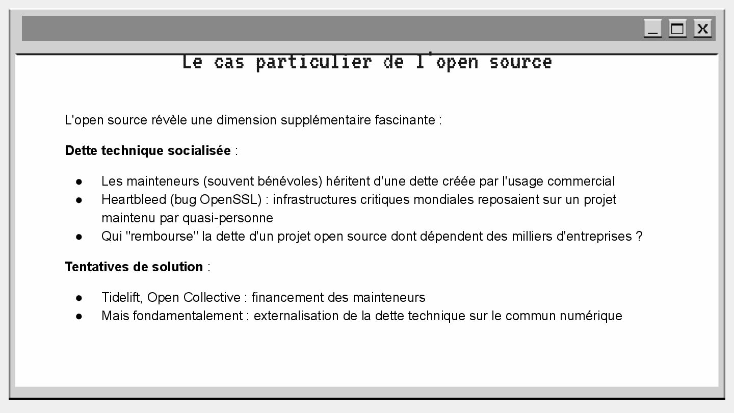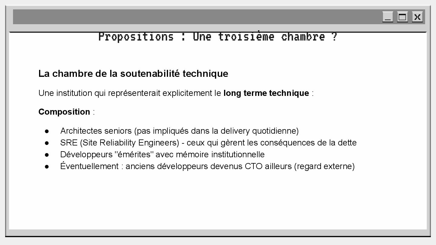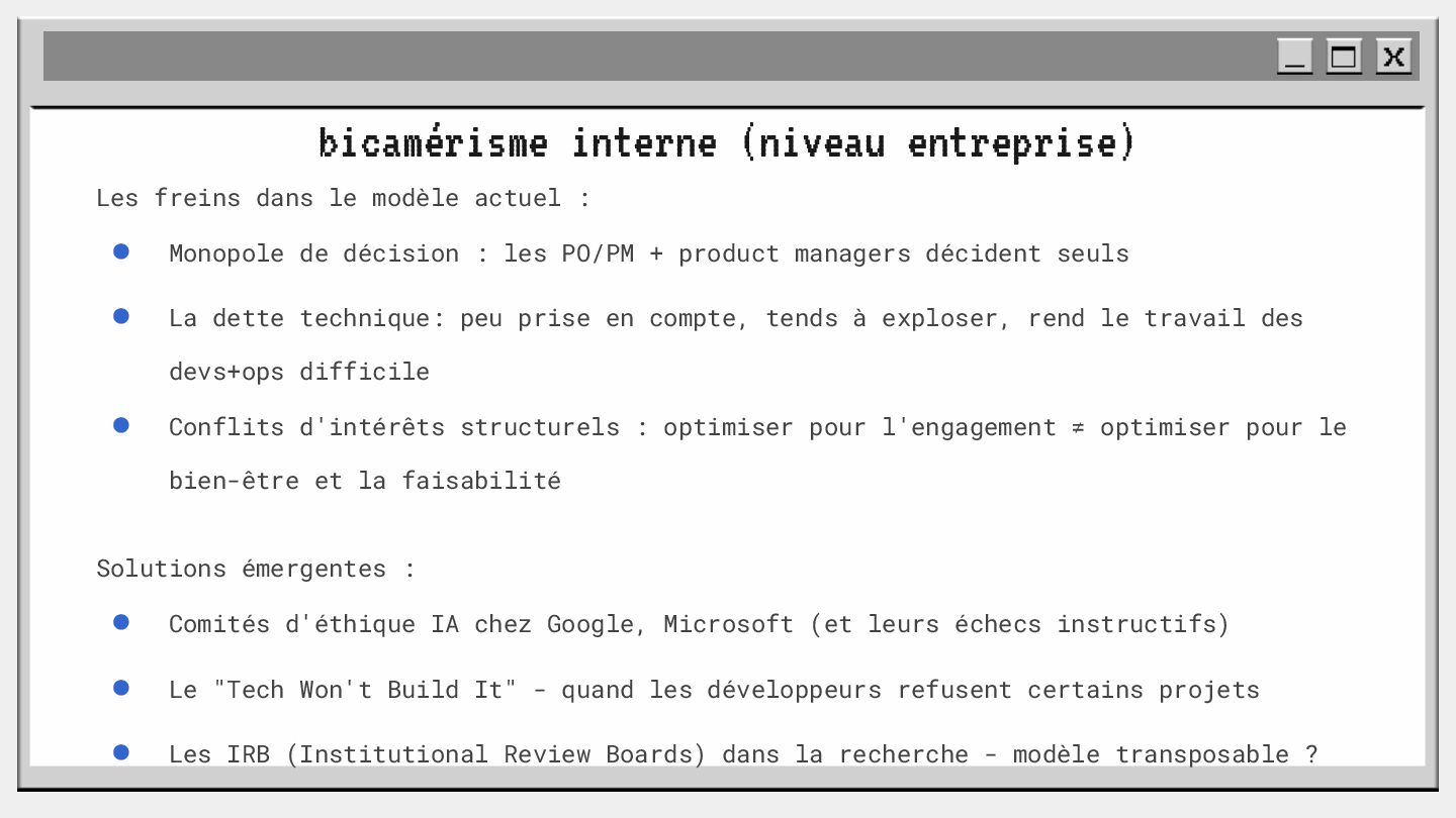 pouvoir" Pour vous, le code n'est surement qu'une suite d'instructions exécutées par une machine ou dans un cloud. Mais il est en réalité tellement plus que cela. Pouvons-nous même, nous faire une idée réelle de tout ce dont il est l'enjeu ? Le code est le vecteur de l'organisation des entreprises, jusqu'à ses idéaux. Ce n'est pas une technique, c'est un miroir. Et si nous osions regarder au travers, pour une fois ? À cause de la diversité à produire du code en entreprise, à cause de la multiplicité des formes d'organisations possibles, mais aussi des différents credo ou chapelles qu'ont créées les "faiseurs" de code; j'ai pu voir nombre de conflits, de résultats plus ou moins heureux, plus ou moins achevés. Une histoire avec des humains, des chef-fes, des technicien-nes, des testeur-euses, des PO, des SM,EM. CTO... et au final, si tout se passe bien, un ou des produits… Je remets tout cela en perspective avec les grandes Sociétés Humaines et l'organisation du Travail. Et je répondrai à ces 6 questions : Qu’est-ce que le code ? Qu’est-ce que le pouvoir de faire du code ? Y a-t-il une société secrète dans votre compagnie ? Quels sont les enjeux du pouvoir ? Quels sont les formes du pouvoir ? Quelles sont les techniques du pouvoir ?