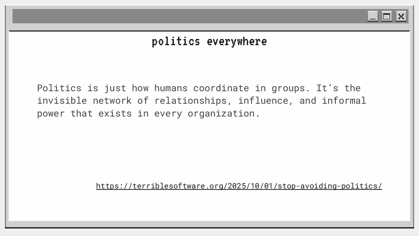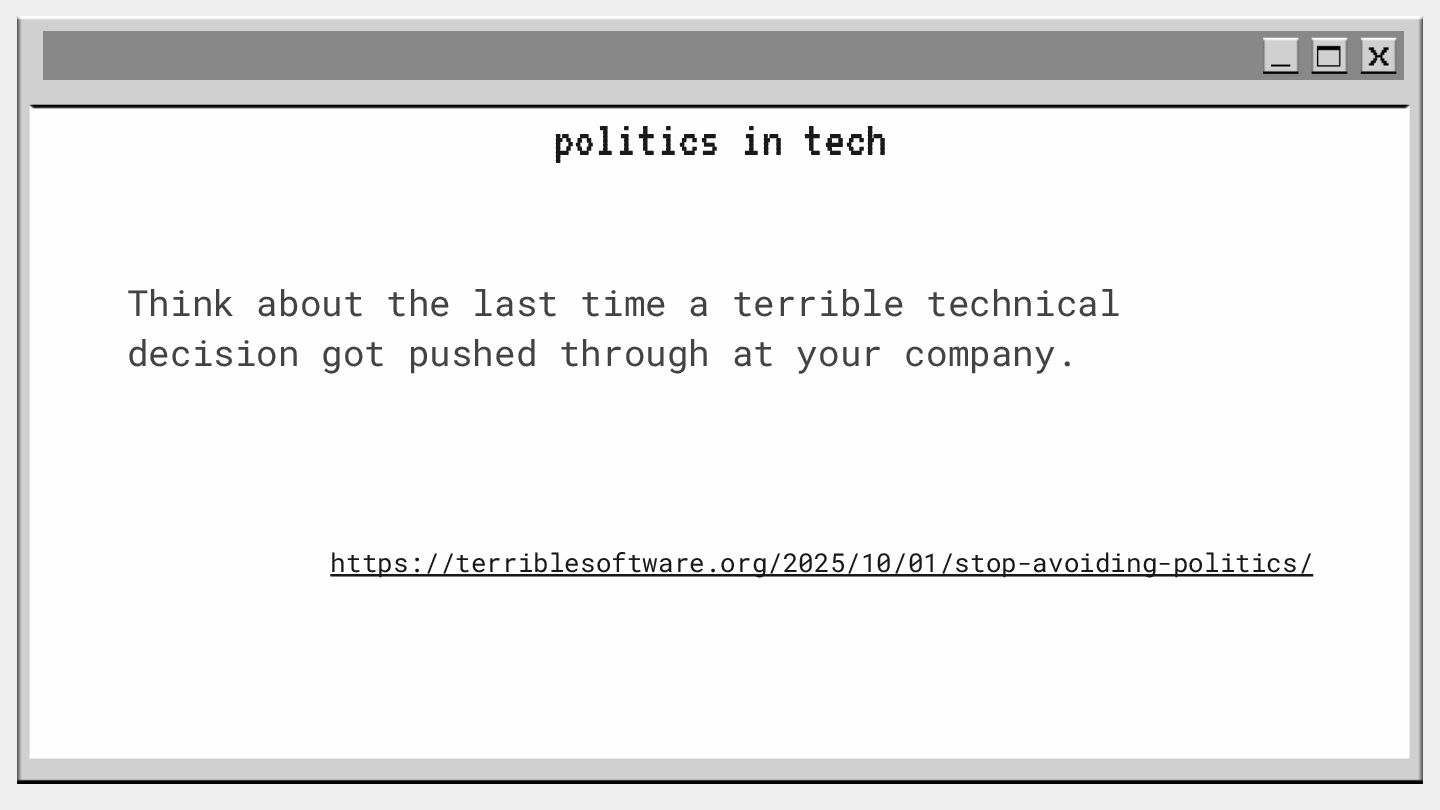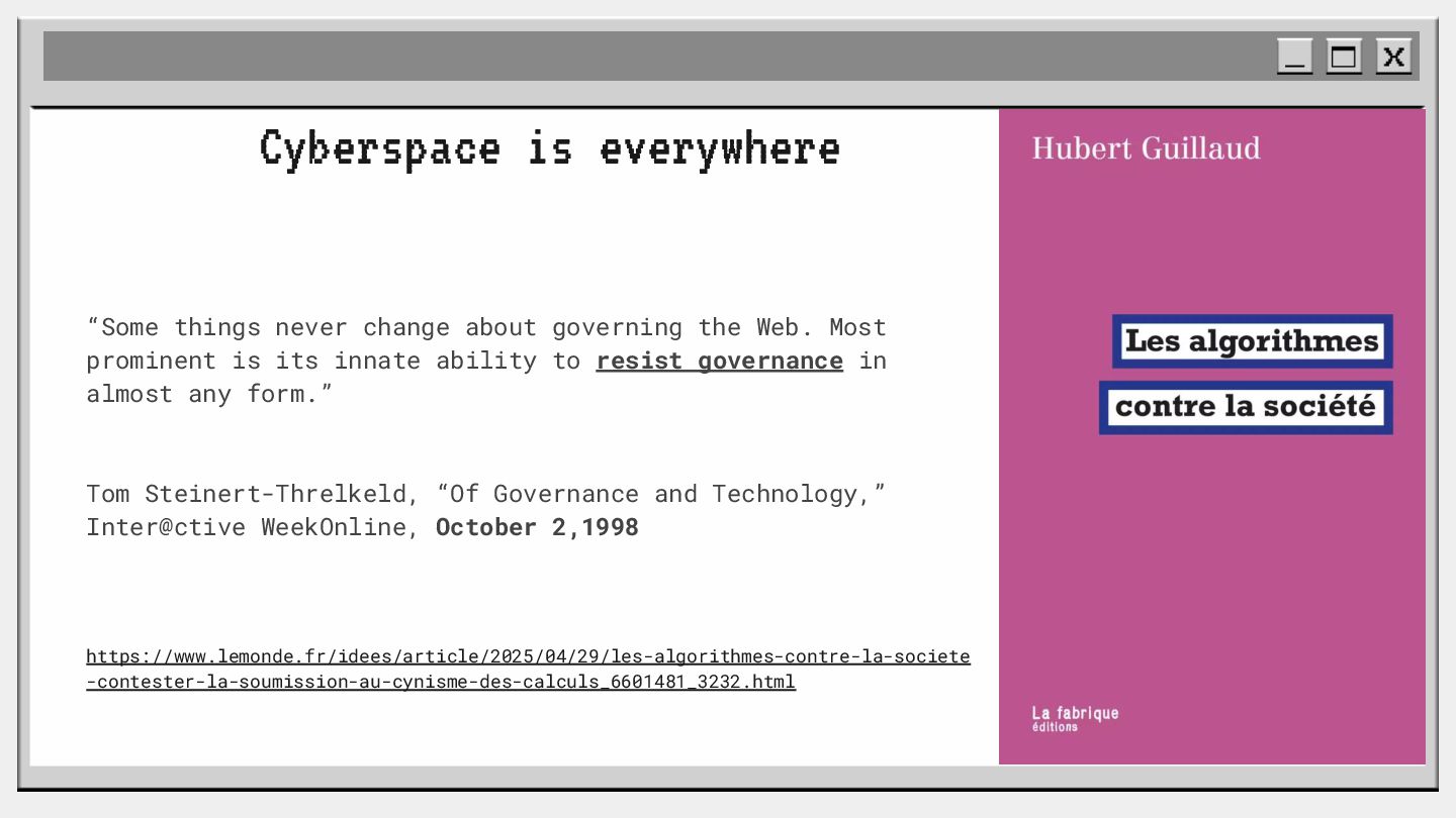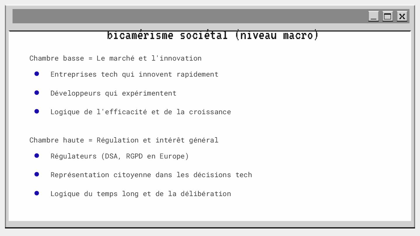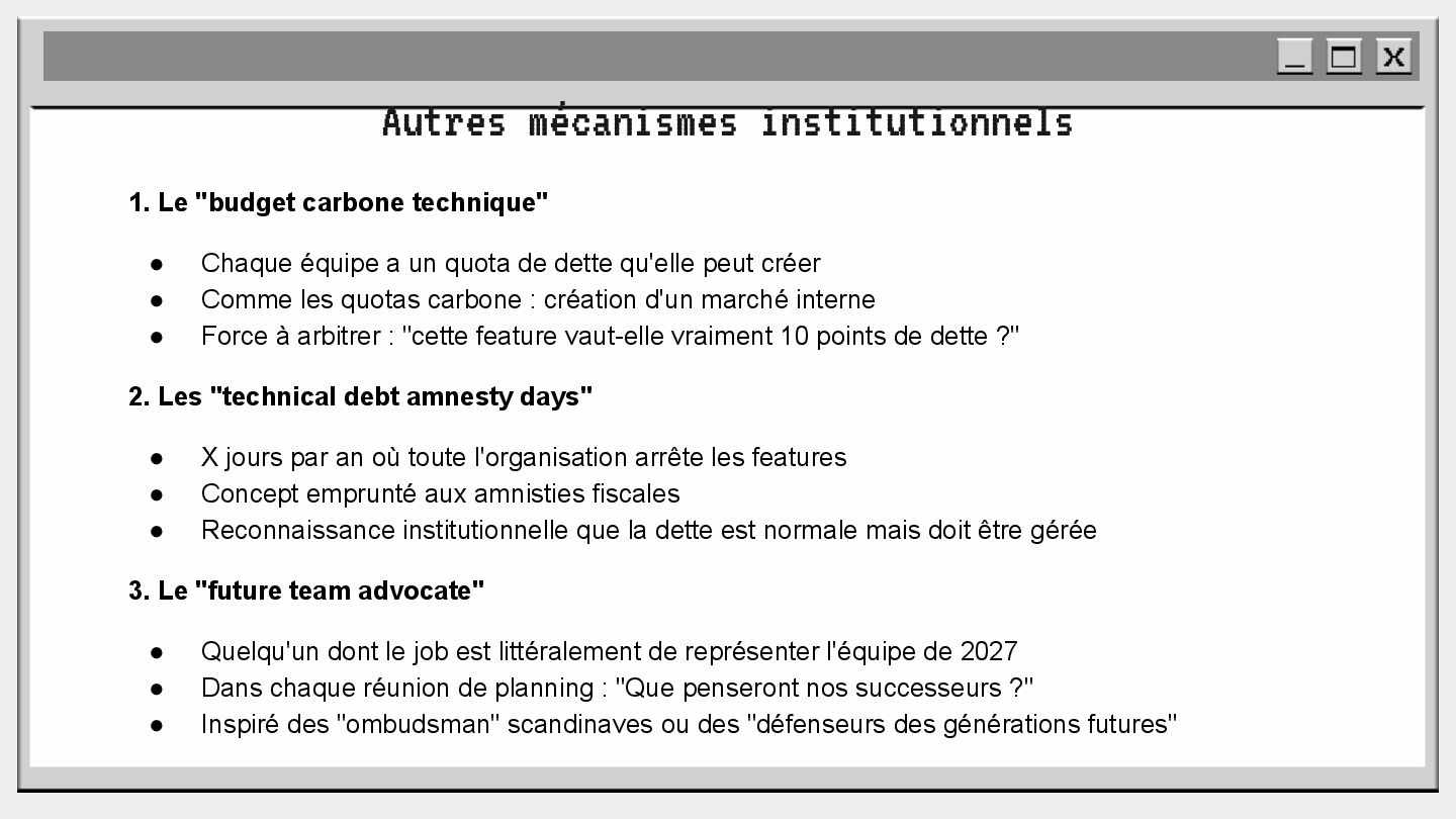 pouvoir" Pour vous, le code n'est surement qu'une suite d'instructions exécutées par une machine ou dans un cloud. Mais il est en réalité tellement plus que cela. Pouvons-nous même, nous faire une idée réelle de tout ce dont il est l'enjeu ? Le code est le vecteur de l'organisation des entreprises, jusqu'à ses idéaux. Ce n'est pas une technique, c'est un miroir. Et si nous osions regarder au travers, pour une fois ? À cause de la diversité à produire du code en entreprise, à cause de la multiplicité des formes d'organisations possibles, mais aussi des différents credo ou chapelles qu'ont créées les "faiseurs" de code; j'ai pu voir nombre de conflits, de résultats plus ou moins heureux, plus ou moins achevés. Une histoire avec des humains, des chef-fes, des technicien-nes, des testeur-euses, des PO, des SM,EM. CTO... et au final, si tout se passe bien, un ou des produits… Je remets tout cela en perspective avec les grandes Sociétés Humaines et l'organisation du Travail. Et je répondrai à ces 6 questions : Qu’est-ce que le code ? Qu’est-ce que le pouvoir de faire du code ? Y a-t-il une société secrète dans votre compagnie ? Quels sont les enjeux du pouvoir ? Quels sont les formes du pouvoir ? Quelles sont les techniques du pouvoir ?