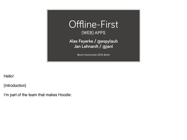 data-driven web apps from the frontend. It‘s like jquery for data storage. And Hoodie is a bit special, because these apps are offline capable by default, meaning they won‘t break when the connection goes down, and this is basically why we‘re so interested in this whole topic. This isn‘t a talk about Hoodie, although it does come up a few times, it‘s about this idea of