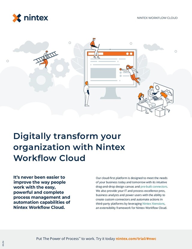 with Nintex Workflow Cloud’s integrated capabilities for process mapping, robotic process automation (RPA), workflow, forms, mobile apps, DocGen®, eSign and process analytics. Manage and expedite recruitment and onboarding effectively with automated processes across departments during every stage, from discovering new talent to ensuring a smooth first day on the job. — Employee onboarding Deep cross-platform integrations Integrate current and new workflows with existing systems of record. Whether your organization invests in Microsoft 365, Google, Salesforce, legacy or on-premises tools, or anything in between, Nintex Workflow Cloud easily connects people, processes and content. Supporting a governed Teams provisioning process and lifecycle management, including Team and channel creation, member management through to archival. — Microsoft Teams integration Gather and store important data from users, not in your ecosystem. — Anonymous forms for customers Automate and standardize data entry into Salesforce from various stakeholders within your business. — Salesforce integration Unrivaled user experience Delight your customers and employees with modern digital experiences with Nintex Workflow Cloud’s easy-to-use tools – with clicks, not code – for quickly managing, automating and optimizing workflows and business processes. Nintex Workflow Cloud is everything you’ve come to expect from our cloud-first software solutions and more. With the power of the Nintex Process Platform, you have easy-to-use process mapping and automation tools at your fingertips to rapidly accelerate your company’s enterprise-wide digital transformation. Achieve immediate benefits Experience common use cases with Nintex Workflow Cloud Put The Power of Process™ to work. Try it today nintex.com/trial/#nwc 08.20v