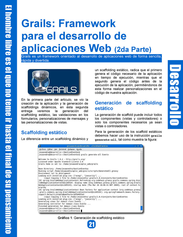 Grails es un framework orientado al desarrollo de aplicaciones web de forma sencilla, rápida y divertida. En la primera parte del artículo, se vio la creación de la aplicación y la generación de scaffoldings dinámicos, en ésta segunda entrega veremos la generación del scaffolding estático, las validaciones en los formularios, personalizaciones de mensajes y las personalizaciones de vistas. Scaffolding estático La diferencia entre un scaffolding dinámico y un scaffolding estático, radica que el primero genera el código necesario de la aplicación en tiempo de ejecución, mientras que el segundo genera el código antes de la ejecución de la aplicación, permitiéndonos de esta forma realizar personalizaciones en el código de nuestra aplicación. Generación de scaffolding estático La generación de scaffold puede incluir todos los componentes (vistas y controladores) o solo los componentes necesarios ya sean vistas o controladores. Para la generación de los scaffold estáticos debemos hacer uso de la instrucción grails generateall, tal como muestra la figura: Gráfico 1: Generación de scaffolding estático