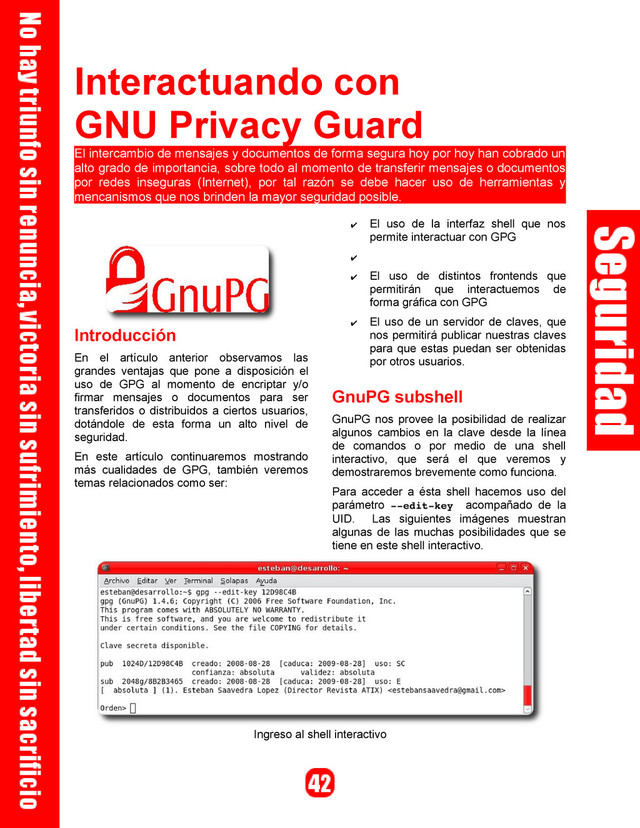 documentos de forma segura hoy por hoy han cobrado un alto grado de importancia, sobre todo al momento de transferir mensajes o documentos por redes inseguras (Internet), por tal razón se debe hacer uso de herramientas y mencanismos que nos brinden la mayor seguridad posible. Introducción En el artículo anterior observamos las grandes ventajas que pone a disposición el uso de GPG al momento de encriptar y/o firmar mensajes o documentos para ser transferidos o distribuidos a ciertos usuarios, dotándole de esta forma un alto nivel de seguridad. En este artículo continuaremos mostrando más cualidades de GPG, también veremos temas relacionados como ser: ✔ El uso de la interfaz shell que nos permite interactuar con GPG ✔ ✔ El uso de distintos frontends que permitirán que interactuemos de forma gráfica con GPG ✔ El uso de un servidor de claves, que nos permitirá publicar nuestras claves para que estas puedan ser obtenidas por otros usuarios. GnuPG subshell GnuPG nos provee la posibilidad de realizar algunos cambios en la clave desde la línea de comandos o por medio de una shell interactivo, que será el que veremos y demostraremos brevemente como funciona. Para acceder a ésta shell hacemos uso del parámetro editkey acompañado de la UID. Las siguientes imágenes muestran algunas de las muchas posibilidades que se tiene en este shell interactivo. Ingreso al shell interactivo