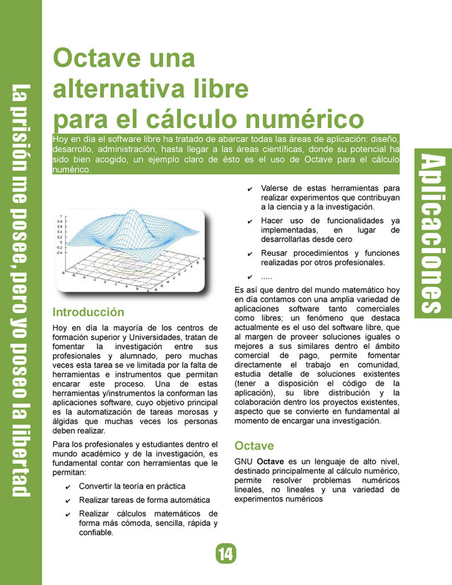 x'): añade una etiqueta al eje de abscisas. Con xlabel off desaparece. ✔ ylabel('etiqueta y'): añade una etiqueta al eje de ordenadas. Con ylabel off desaparece. ✔ text(x,y,'texto'): introduce 'texto' en el lugar especificado por las coordenadas x e y. Si x e y son vectores, el texto se repite por cada par de elementos. Si texto es también un vector de cadenas de texto de la misma dimensión, cada elemento se escribe en las coordenadas correspondientes. ✔ legend(): define rótulos para las distintas líneas o ejes utilizados en la figura. Para más detalle, consultar el Help. ✔ grid: activa la inclusión de una cuadrícula en el dibujo. Con grid off desaparece la cuadrícula. Interacción con lenguajes de programación Una de las grandes virtudes de Octave es brindar la posibilidad de ser utilizado desde una aplicación desarrollada en lenguajes de programación como: Python, Perl, C, C++; cualidad que hace que se pueda reutilizar esta poderosa herramienta desde el desarrollo de nuestras propias aplicaciones. Poder de Octave Este artículo solo intenta mostrar una pequeña parte del gran potencial que se dispone en Octave. Adicionalmente comentar que muchísimas universidades en todo el mundo han incluido a esta herramienta por sus buenas características, innumerables funciones implementadas y sobre todo por su facilidad de uso y rapidez en su curva de aprendizaje. Referencias [1] http://www.gnu.org/software/octave/ Autores Pilar Castel Diaz Centro de Investigación en Física y Matemáticas (ES) [email protected] Esteban Saavedra López Líder de la Comunidad ATIX (Oruro – Bolivia) Activista de Software Libre en Bolivia [email protected] http://jesaavedra.opentelematics.org