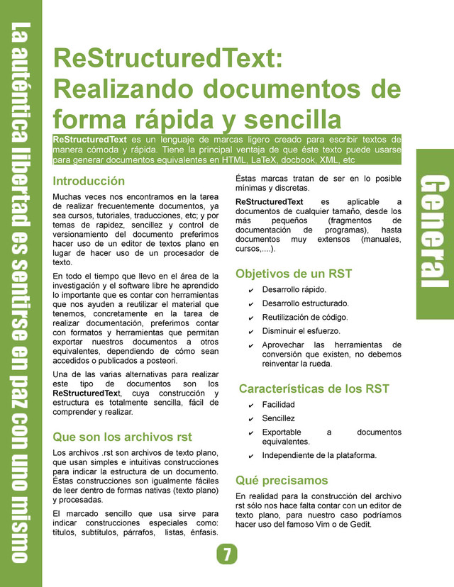 un lenguaje de marcas ligero creado para escribir textos de manera cómoda y rápida. Tiene la principal ventaja de que éste texto puede usarse para generar documentos equivalentes en HTML, LaTeX, docbook, XML, etc Introducción Muchas veces nos encontramos en la tarea de realizar frecuentemente documentos, ya sea cursos, tutoriales, traducciones, etc; y por temas de rapidez, sencillez y control de versionamiento del documento preferimos hacer uso de un editor de textos plano en lugar de hacer uso de un procesador de texto. En todo el tiempo que llevo en el área de la investigación y el software libre he aprendido lo importante que es contar con herramientas que nos ayuden a reutilizar el material que tenemos, concretamente en la tarea de realizar documentación, preferimos contar con formatos y herramientas que permitan exportar nuestros documentos a otros equivalentes, dependiendo de cómo sean accedidos o publicados a posteori. Una de las varias alternativas para realizar este tipo de documentos son los ReStructuredText, cuya construcción y estructura es totalmente sencilla, fácil de comprender y realizar. Que son los archivos rst Los archivos .rst son archivos de texto plano, que usan simples e intuitivas construcciones para indicar la estructura de un documento. Éstas construcciones son igualmente fáciles de leer dentro de formas nativas (texto plano) y procesadas. El marcado sencillo que usa sirve para indicar construcciones especiales como: títulos, subtítulos, párrafos, listas, énfasis. Éstas marcas tratan de ser en lo posible mínimas y discretas. ReStructuredText es aplicable a documentos de cualquier tamaño, desde los más pequeños (fragmentos de documentación de programas), hasta documentos muy extensos (manuales, cursos,....). Objetivos de un RST ✔ Desarrollo rápido. ✔ Desarrollo estructurado. ✔ Reutilización de código. ✔ Disminuir el esfuerzo. ✔ Aprovechar las herramientas de conversión que existen, no debemos reinventar la rueda. Características de los RST ✔ Facilidad ✔ Sencillez ✔ Exportable a documentos equivalentes. ✔ Independiente de la plataforma. Qué precisamos En realidad para la construcción del archivo rst sólo nos hace falta contar con un editor de texto plano, para nuestro caso podríamos hacer uso del famoso Vim o de Gedit.