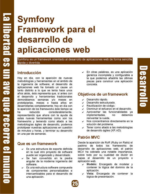 ninguna tarea especifica, pero podemos observarla ejecutándose en algunos de sus entornos, por medio del browser, como muestra la siguiente figura: Gráfico 4a: Entorno de Producción Gráfico 4b: Entorno de desarrollo Modelado del dominio Para describir el dominio de nuestra aplicación, symfony provee 2 alternativas: Crear el esquema del dominio de forma manual. Crear el esquema del dominio de forma automática desde una base de datos ya existente. En este tutorial haremos uso de la primera alternativa; esta descripción debe ir incluida en el fichero config/schema.yml, así: --- propel: evento: _attributes: { phpName: Evento } idMethod: native id: {type: INTEGER, required: true, autoIncrement: true, primaryKey: true} nombre: {type: varchar, size: 50} ciudad: {type: varchar, size: 50} inicia: {type: date} finaliza: {type: date} sitioweb: {type: varchar, size: 50} expositor: _attributes: { phpName: Expositor } idMethod: native id: {type: INTEGER, required: true, autoIncrement: true, primaryKey: true} paterno: {type: varchar, size: 25} materno: {type: varchar, size: 25} nombre: {type: varchar, size: 25} nacionalidad: {type: varchar, size: 25} email: {type: varchar, size: 50} conferencia: _attributes: { phpName: Conferencia } id: {type: INTEGER, required: true, autoIncrement: true, primaryKey: true} evento_id: expositor_id: fecha: {type: date} titulo: {type: varchar, size: 50} resumen:{type: longvarchar} Generación del modelo orientado a objetos Symfony permite generar el modelo orientado a objetos en base al esquema (config/schema.yml), modelo que nos permitirá hacer uso de los conceptos y facilidades brindadas por el paradigma orientado a objeto. Esta generación se la realiza mediante la instrucción: symfony propel-build-model Generación del script SQL Como en nuestra aplicación creamos de forma manual el esquema correspondiente al dominio de nuestra aplicación, debemos generar el script SQL para la creación de las tablas correspondientes en la base de datos utilizada en nuestra aplicación, en nuestro caso ejecutaremos este script en un servidor