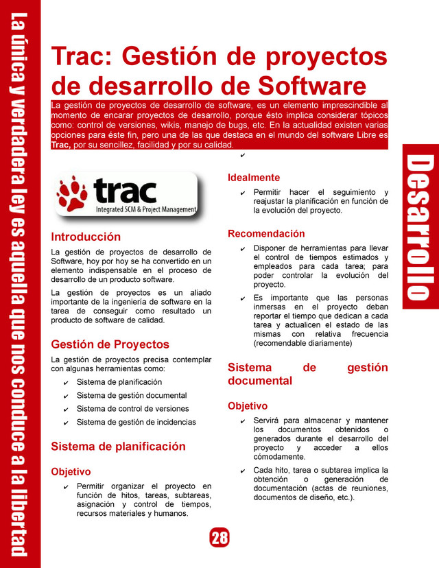 de proyectos de desarrollo de software, es un elemento imprescindible al momento de encarar proyectos de desarrollo, porque ésto implica considerar tópicos como: control de versiones, wikis, manejo de bugs, etc. En la actualidad existen varias opciones para éste fin, pero una de las que destaca en el mundo del software Libre es Trac, por su sencillez, facilidad y por su calidad. Introducción La gestión de proyectos de desarrollo de Software, hoy por hoy se ha convertido en un elemento indispensable en el proceso de desarrollo de un producto software. La gestión de proyectos es un aliado importante de la ingeniería de software en la tarea de conseguir como resultado un producto de software de calidad. Gestión de Proyectos La gestión de proyectos precisa contemplar con algunas herramientas como: ✔ Sistema de planificación ✔ Sistema de gestión documental ✔ Sistema de control de versiones ✔ Sistema de gestión de incidencias Sistema de planificación Objetivo ✔ Permitir organizar el proyecto en función de hitos, tareas, subtareas, asignación y control de tiempos, recursos materiales y humanos. ✔ Idealmente ✔ Permitir hacer el seguimiento y reajustar la planificación en función de la evolución del proyecto. Recomendación ✔ Disponer de herramientas para llevar el control de tiempos estimados y empleados para cada tarea; para poder controlar la evolución del proyecto. ✔ Es importante que las personas inmersas en el proyecto deban reportar el tiempo que dedican a cada tarea y actualicen el estado de las mismas con relativa frecuencia (recomendable diariamente) Sistema de gestión documental Objetivo ✔ Servirá para almacenar y mantener los documentos obtenidos o generados durante el desarrollo del proyecto y acceder a ellos cómodamente. ✔ Cada hito, tarea o subtarea implica la obtención o generación de documentación (actas de reuniones, documentos de diseño, etc.).