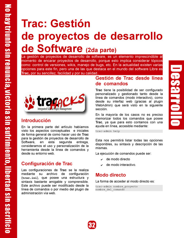 La gestión de proyectos de desarrollo de software, es un elemento imprescindible al momento de encarar proyectos de desarrollo, porque esto implica considerar tópicos como: control de versiones, wikis, manejo de bugs, etc. En la actualidad existen varias opciones para este fin, pero una de las que destaca en el mundo del software Libre es Trac, por su sencillez, facilidad y por su calidad.. Introducción En la primera parte del artículo habíamos visto los aspectos conceptuales e iniciales de forma general de como hacer uso de Trac para la gestión de proyectos de desarrollo de Software, en esta segunda entrega, consideramos el uso y personalización de la herramienta desde la línea de comandos y desde su entorno web. Configuración de Trac Las configuraciones de Trac se la realiza mediante su archivo de configuración (trac.ini), que posee una estructura y sintaxis bastante amigable y comprensible. Este archivo puede ser modificado desde la línea de comandos o por medio del plugin de administración vía web. Gestión de Trac desde línea de comandos Trac tiene la posibilidad de ser configurado personalizado y gestionado tanto desde la línea de comandos (modo interactivo), como desde su interfaz web (gracias al plugin WebAdmin) que será visto en la siguiente sección. En la mayoría de los casos no es preciso memorizar todos los comandos que posee Trac, ya que para esto contamos con una ayuda en línea, accesible mediante: trac-admin help Esta nos permitirá listar todas las opciones disponibles, su sintaxis y descripción de las mismas. La ejecución de comandos puede ser: ✔ de modo directo ✔ de modo interactivo. Modo directo La forma de acceder al modo directo es: trac-admin nombre_proyecto nombre_del_comando