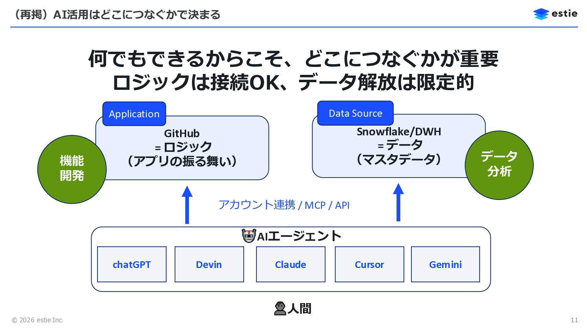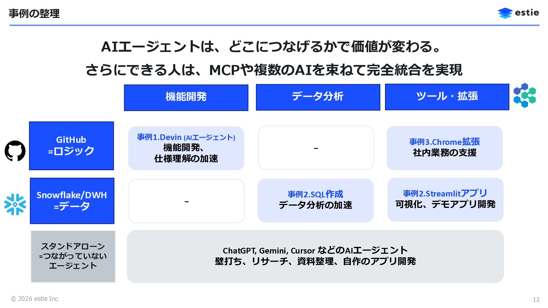 © 2026 estie Inc. (再掲)AI活用はどこにつなぐかで決まる 11 何でもできるからこそ、どこにつなぐかが重要 ロジックは接続OK、データ解放は限定的 GitHub =