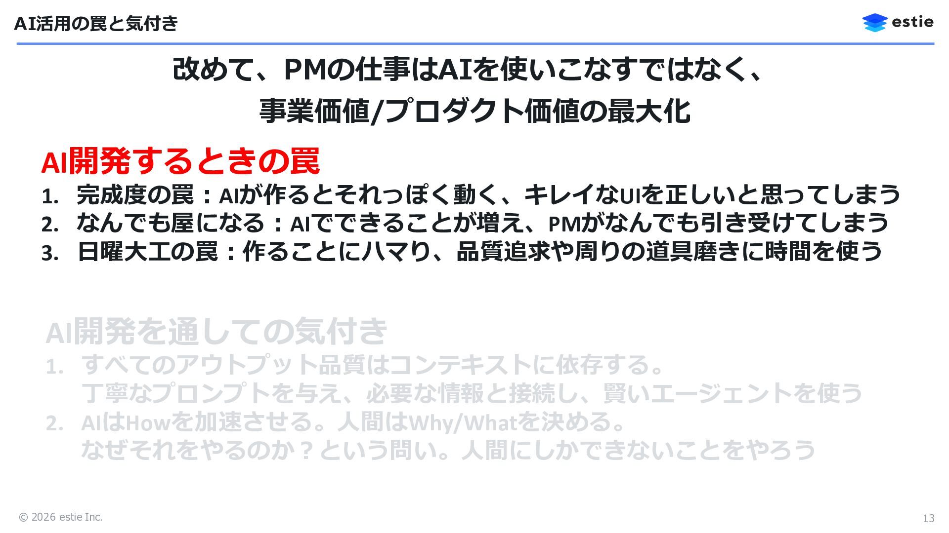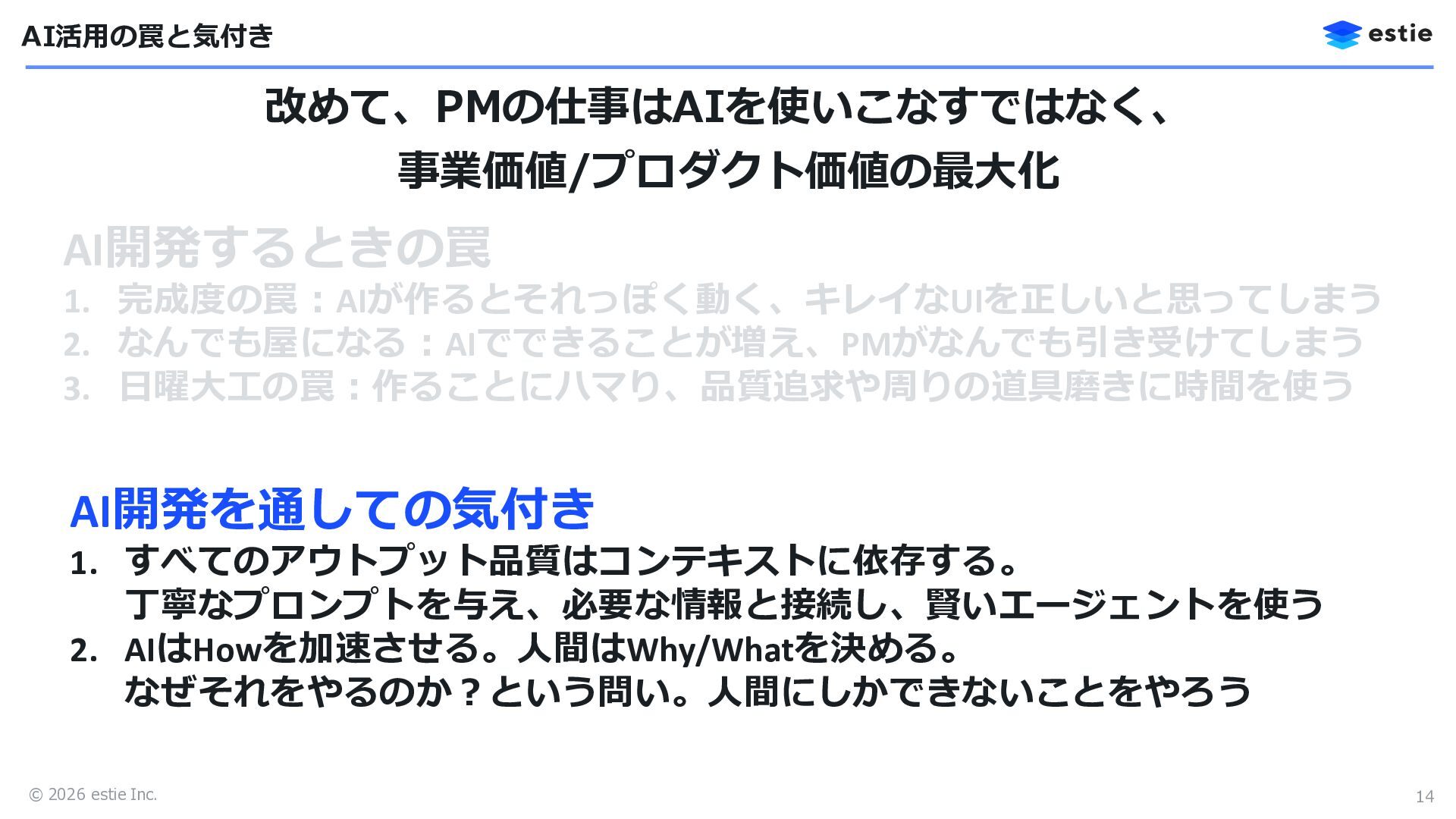 © 2026 estie Inc. 13 改めて、PMの仕事はAIを使いこなすではなく、 事業価値/プロダクト価値の最大化 AI活用の罠と気付き AI開発するときの罠 1.