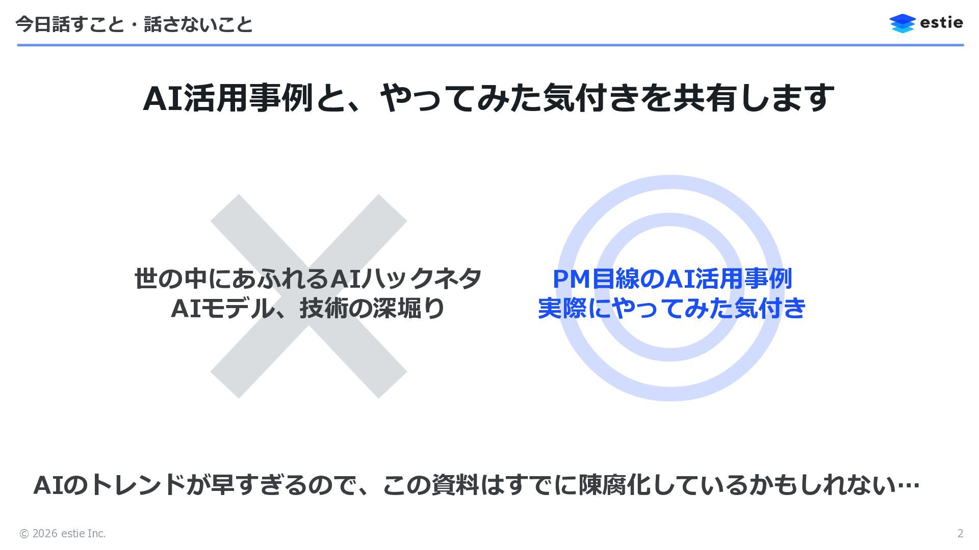 © 2026 estie Inc. 今日話すこと・話さないこと 2 世の中にあふれるAIハックネタ AIモデル、技術の深堀り AI活用事例と、やってみた気付きを共有します PM目線のAI活用事例