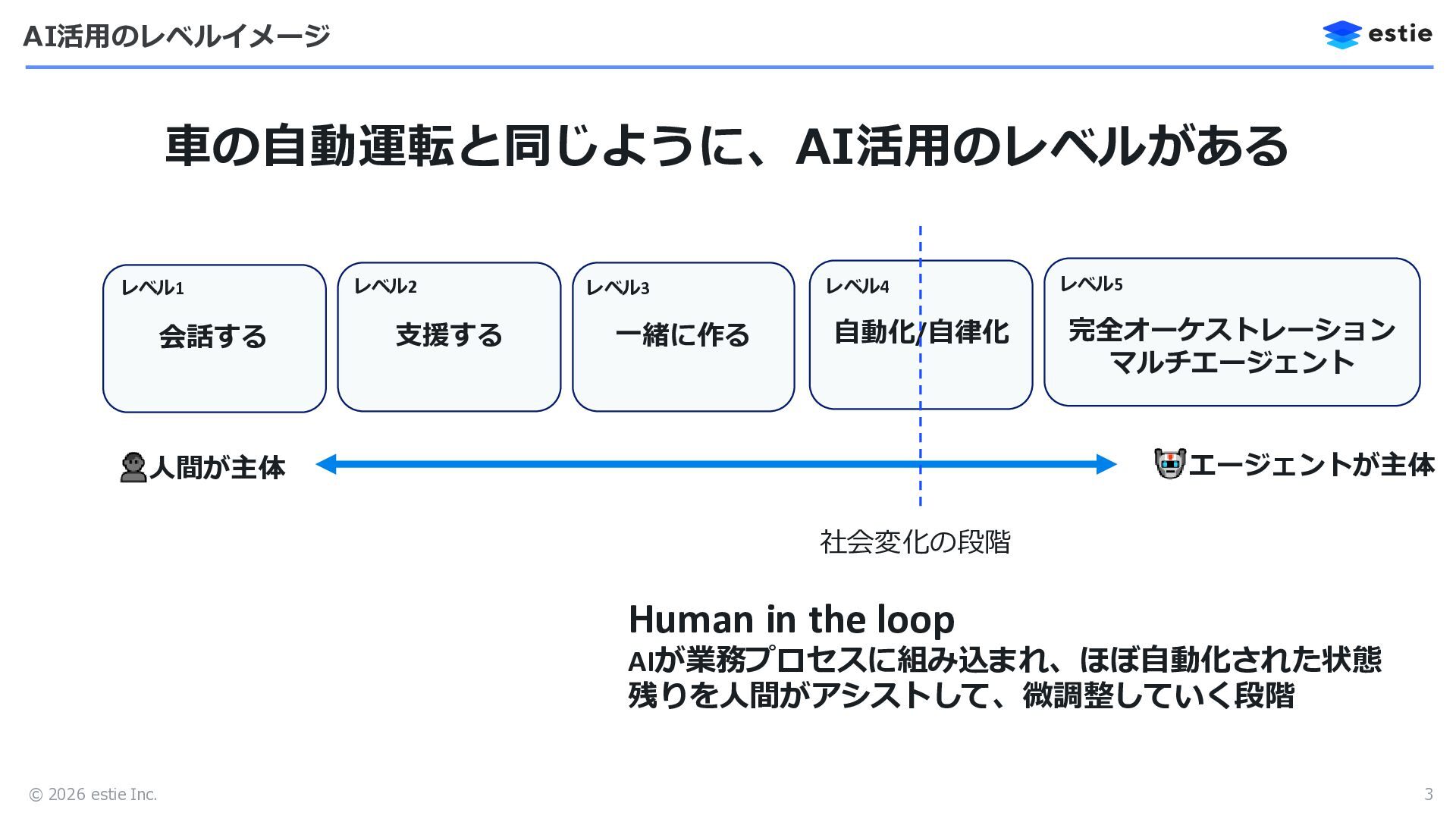 © 2026 estie Inc. AI活用のレベルイメージ 3 車の自動運転と同じように、AI活用のレベルがある 会話する 支援する 一緒に作る
