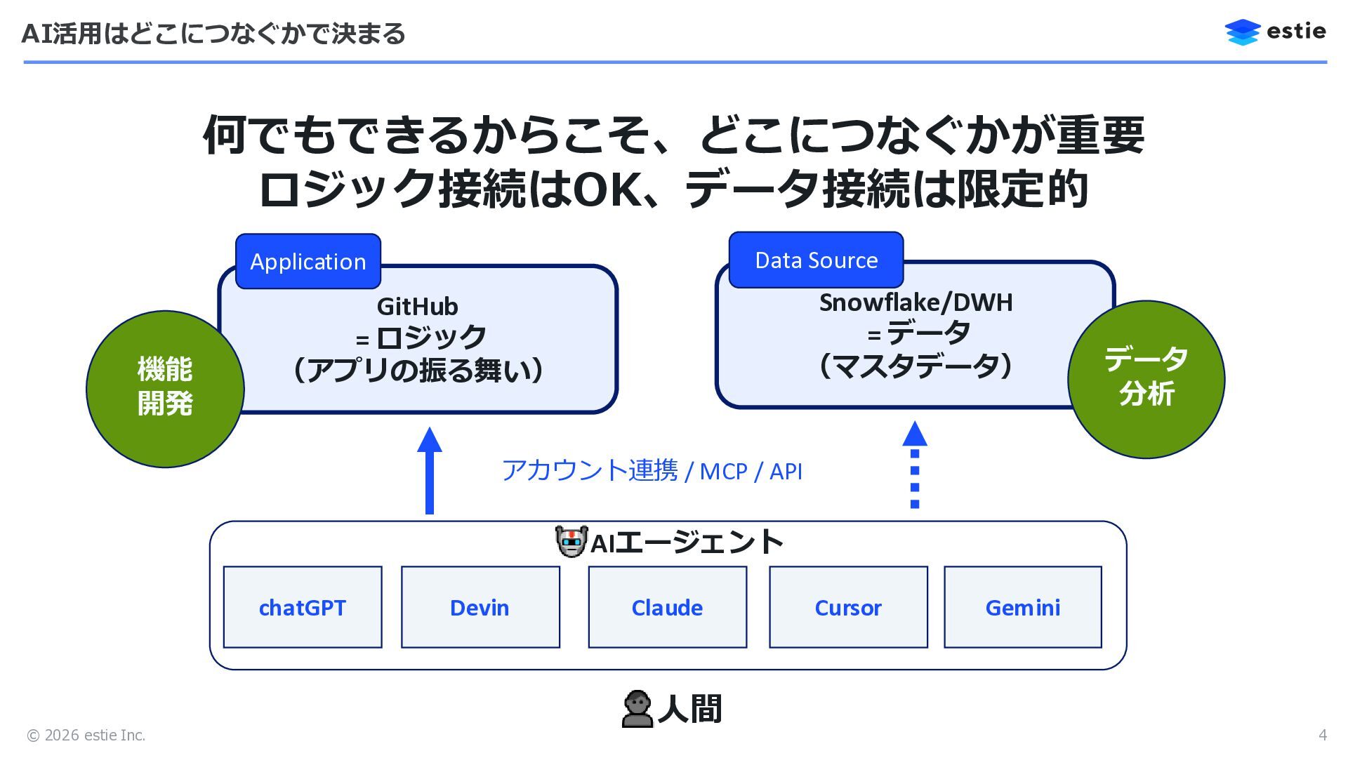 © 2026 estie Inc. AI活用はどこにつなぐかで決まる 4 何でもできるからこそ、どこにつなぐかが重要 ロジック接続はOK、データ接続は限定的 GitHub =