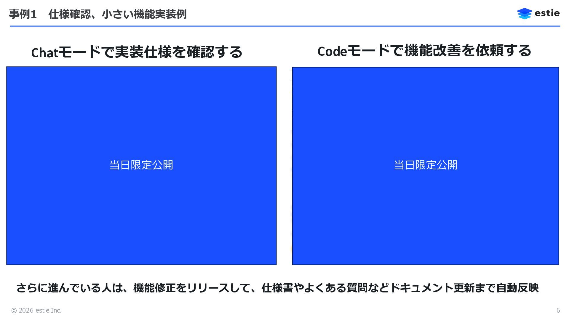 © 2026 estie Inc. 事例1 仕様確認、小さい機能実装例 6 Chatモードで実装仕様を確認する Codeモードで機能改善を依頼する さらに進んでいる人は、機能修正をリリースして、仕様書やよくある質問などドキュメント更新まで自動反映