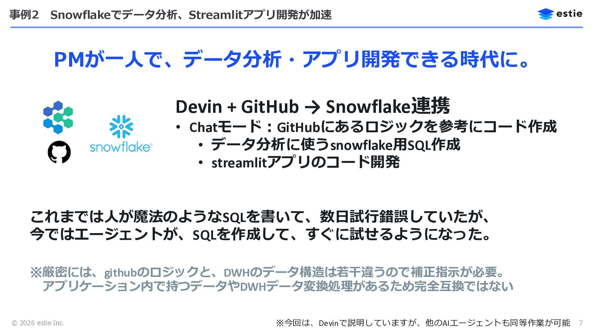 © 2026 estie Inc. 事例2 Snowflakeでデータ分析、Streamlitアプリ開発が加速 7 PMが一人で、データ分析・アプリ開発できる時代に。 Devin +