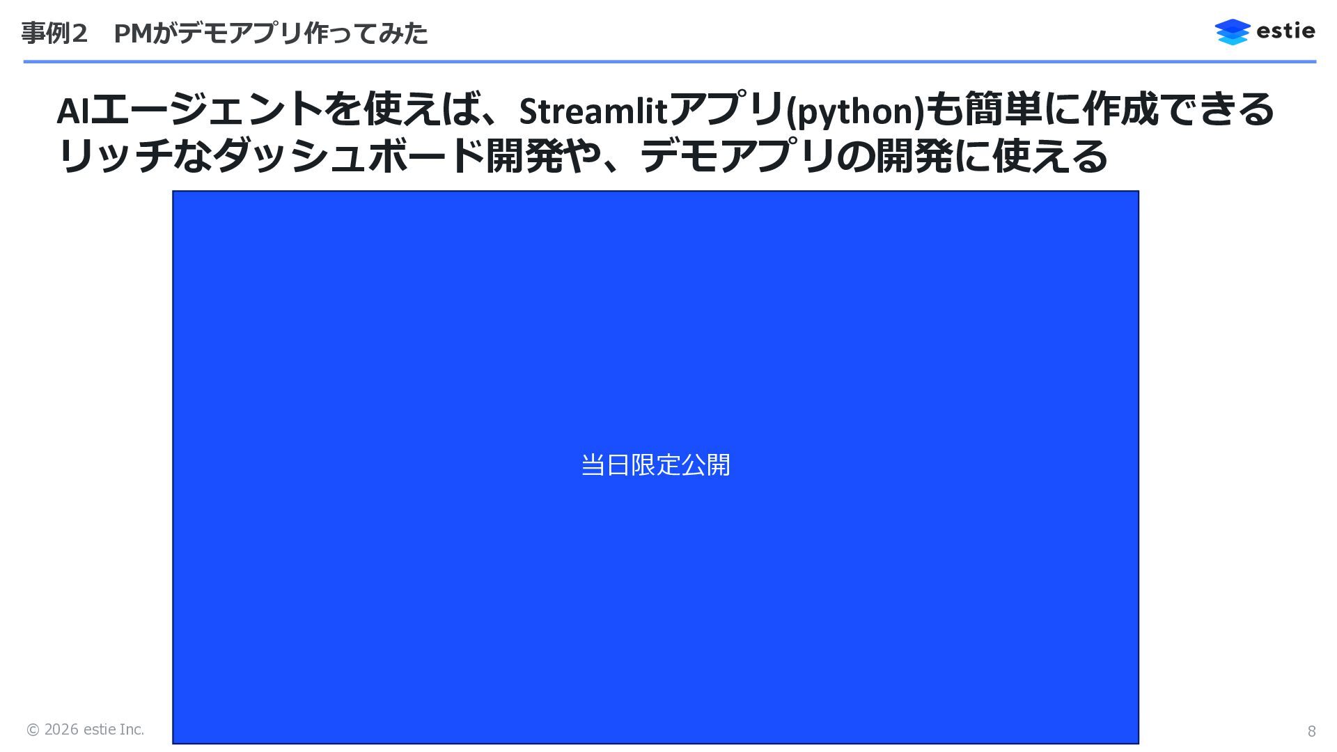 © 2026 estie Inc. 事例2 PMがデモアプリ作ってみた AIエージェントを使えば、Streamlitアプリ(python)も簡単に作成できる リッチなダッシュボード開発や、デモアプリの開発に使える 8 当日限定公開