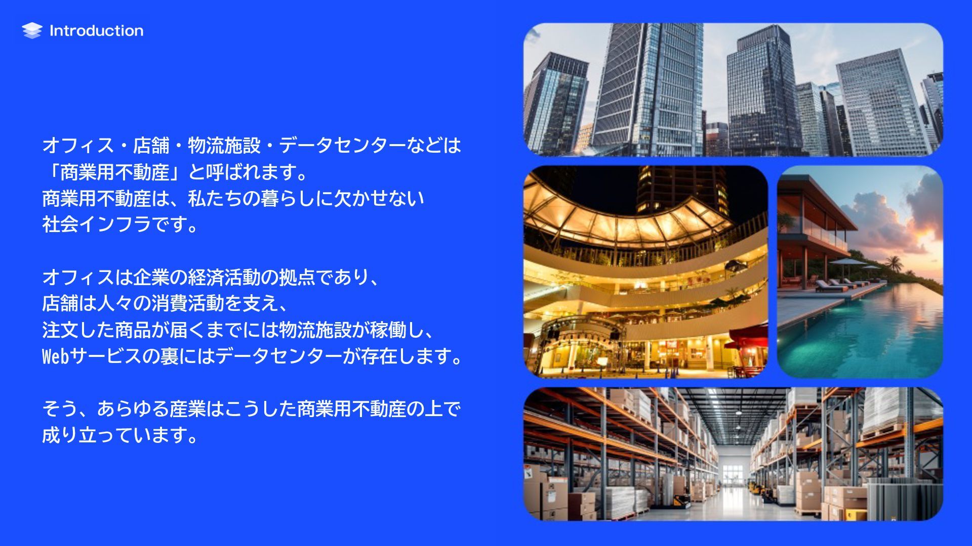 店舗は人々の消費活動を支え、 注文した商品が届くまでには物流施設が稼働し、 Webサービスの裏にはデータセンターが存在します。 そう、あらゆる産業はこうした商業用不動産の上で 成り立っています。