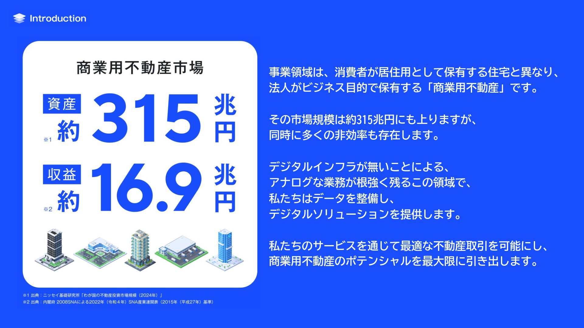 ⽴地選択が可能に オフィス、物流施設など アセットは問わない 都市の未来を データドリブンに導く 最も社会価値の⼤きい 都市の構造を⾏政とともに定義 東京に世界中から 投資を呼び込む New YorkやLondonのような クレーンが眠らない街に進化 現在︓マッチング 未来︓⼟地の価値を上げる 現在の⽴地マッチングから始まり、 ⼟地の価値を上げるまちづくりを⽬指す