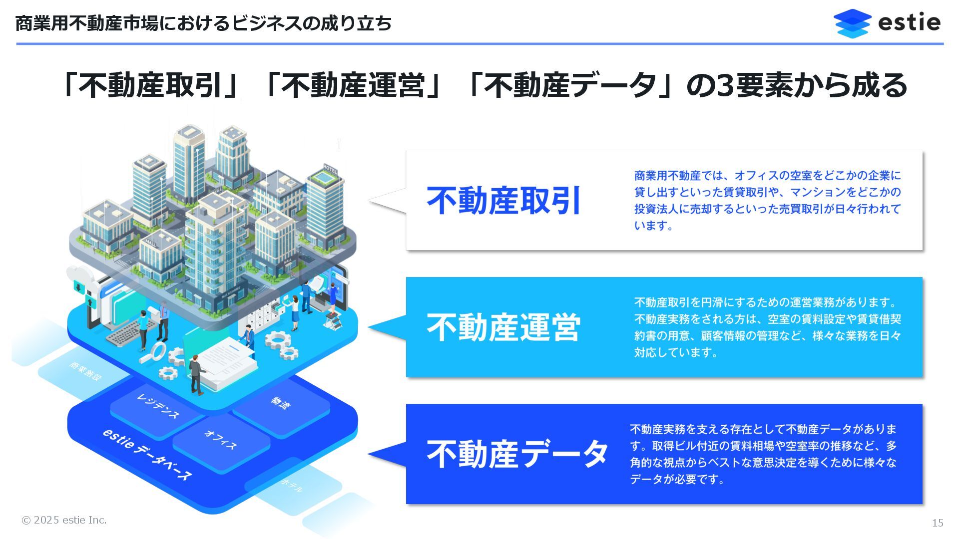 4. © 2025 estie Inc. 12 オフィス・店舗・物流施設・データセンターなどは 「商業用不動産」と呼ばれます。 商業用不動産は、私たちの暮らしに欠かせない 社会インフラです。 オフィスは企業の経済活動の拠点であり、