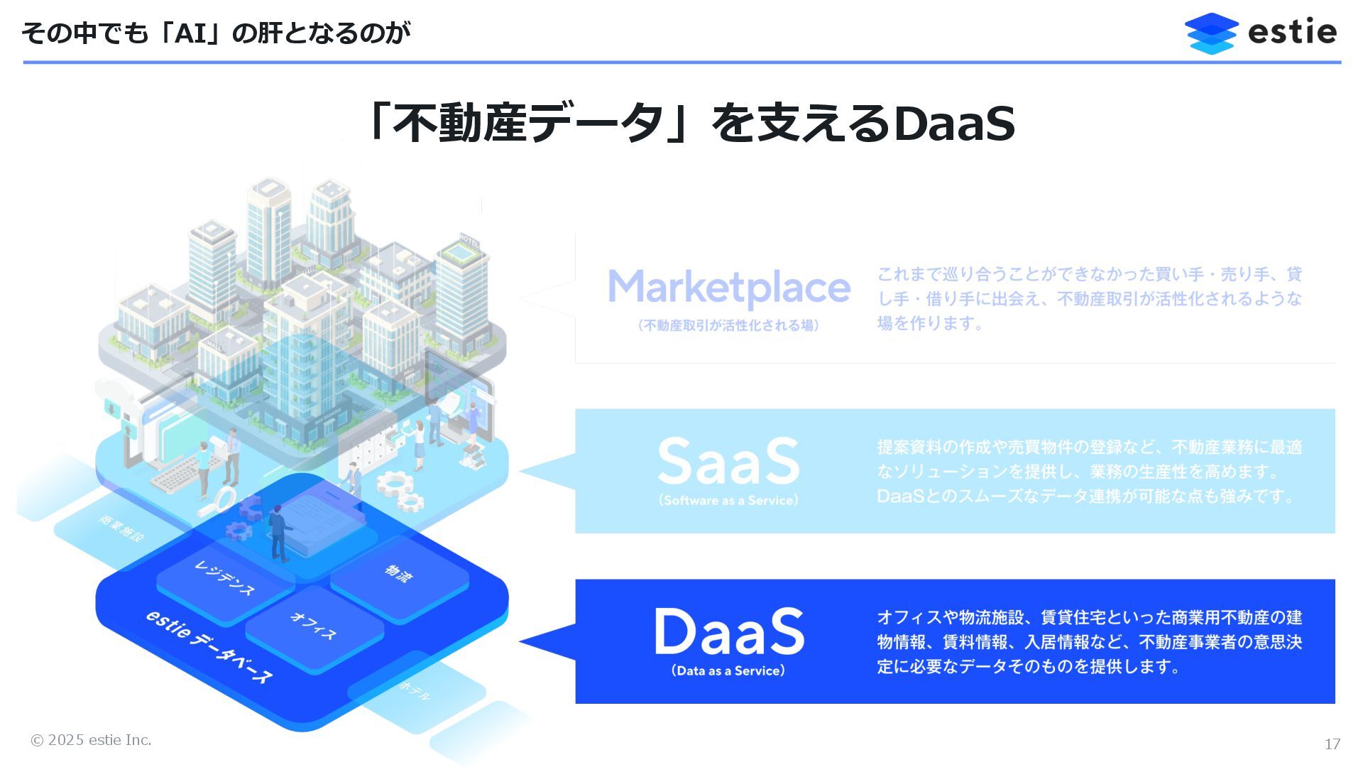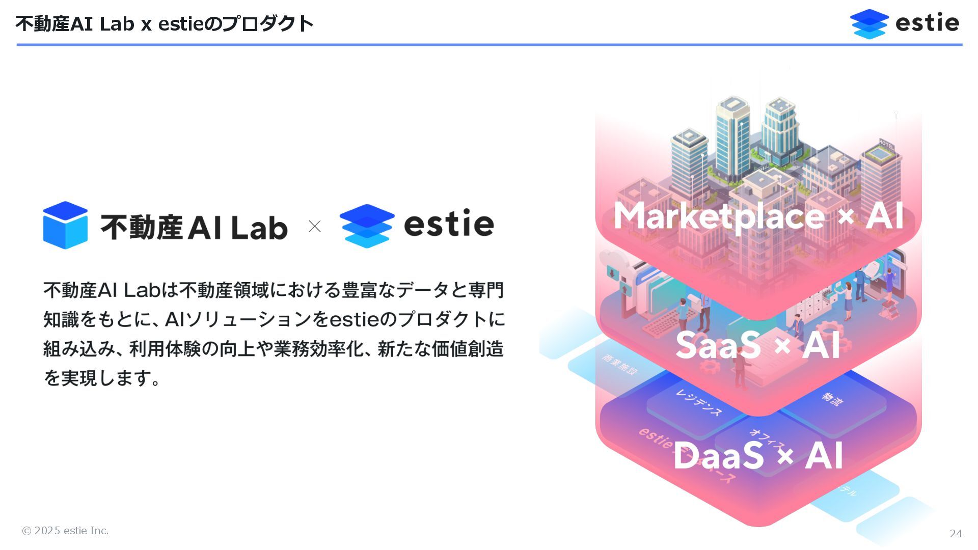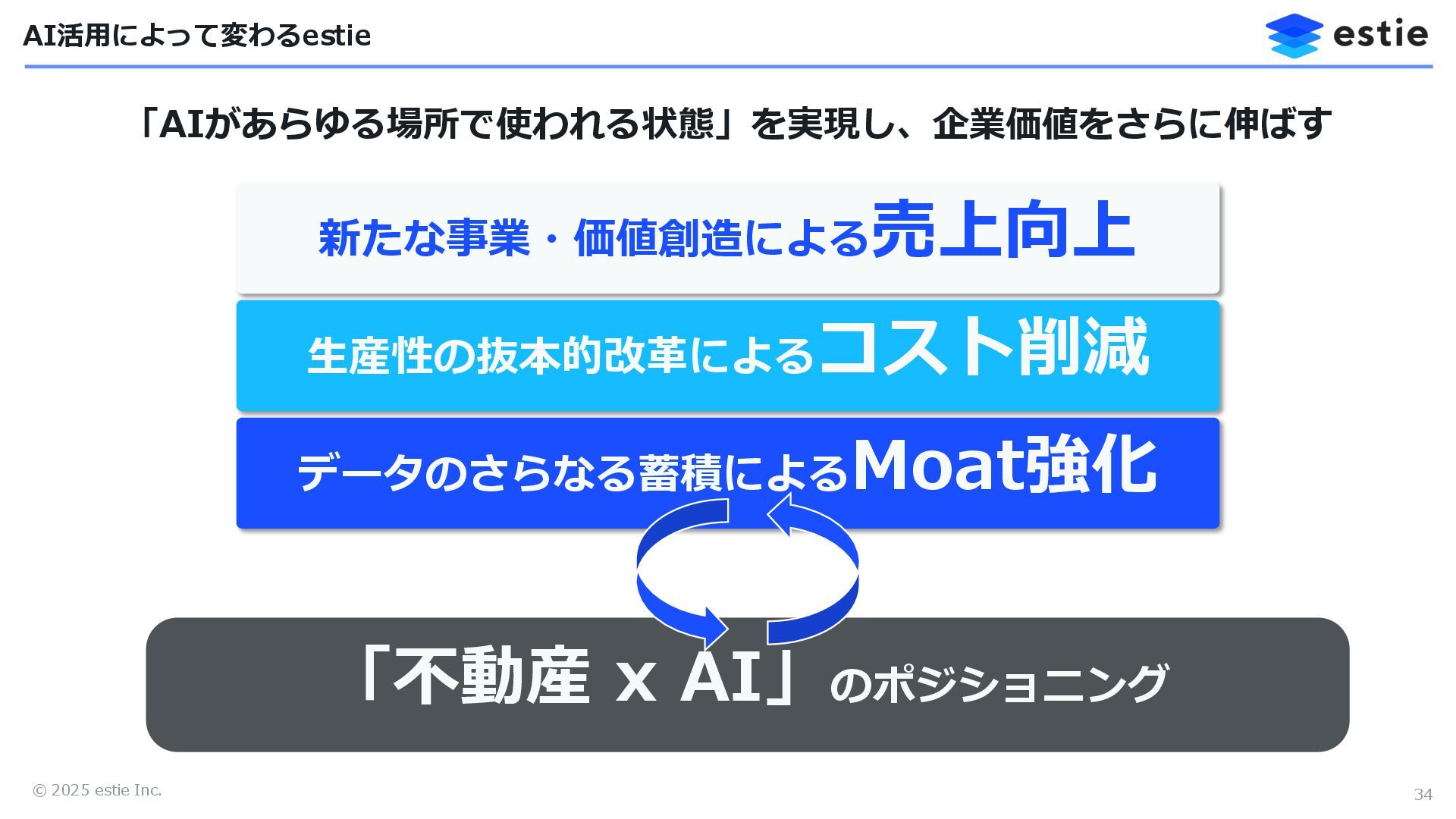 7. © 2025 estie Inc. AI活⽤によって変わるestie 34 「AIがあらゆる場所で使われる状態」を実現し、企業価値をさらに伸ばす 「不動産 x AI」のポジショニング