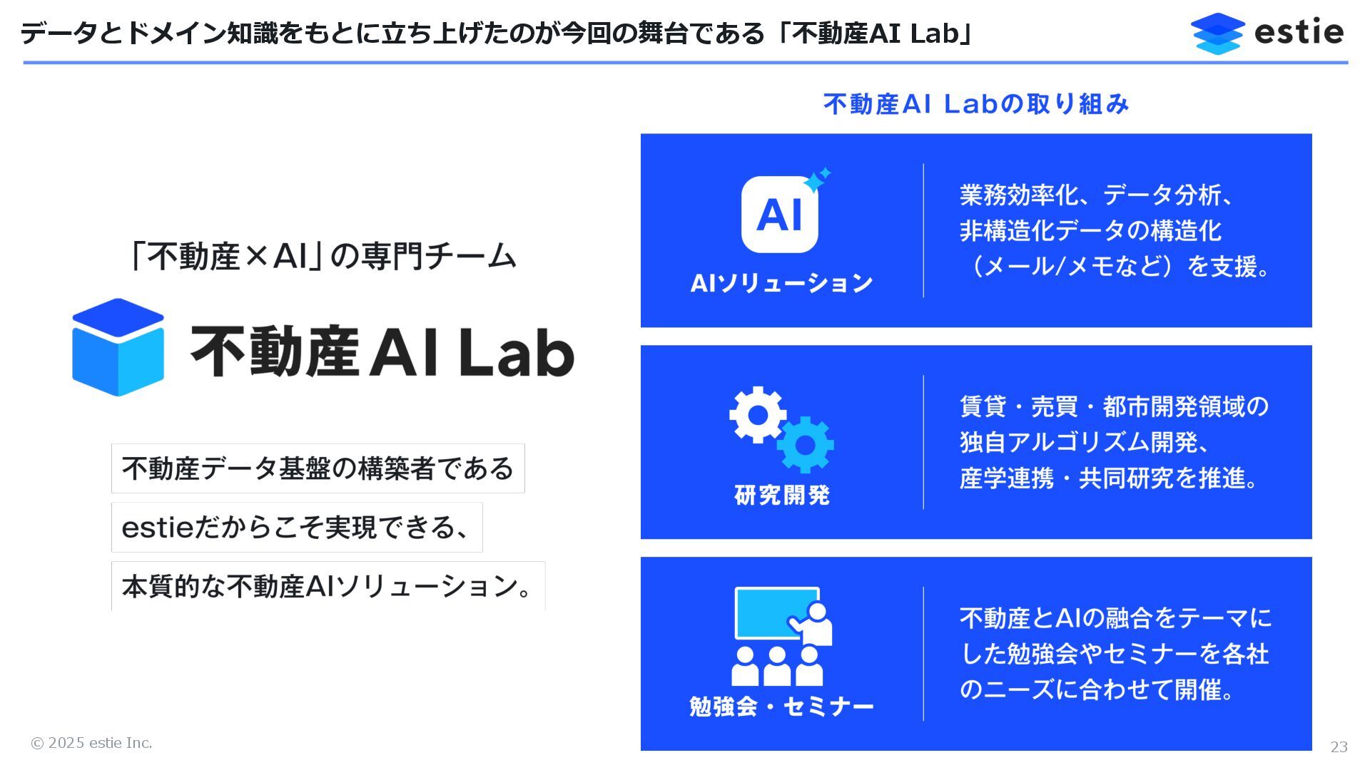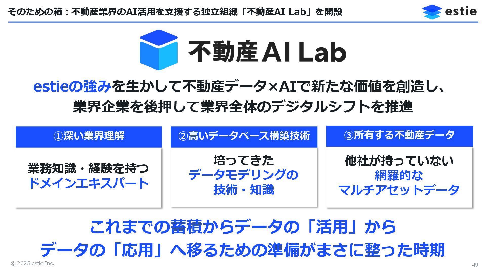 13. © 2025 estie Inc. estieの強みを⽣かして不動産データ×AIで新たな価値を創造し、 業界企業を後押して業界全体のデジタルシフトを推進 49 そのための箱︓不動産業界のAI活⽤を⽀援する独⽴組織「不動産AI Lab」を開設 業務知識・経験を持つ