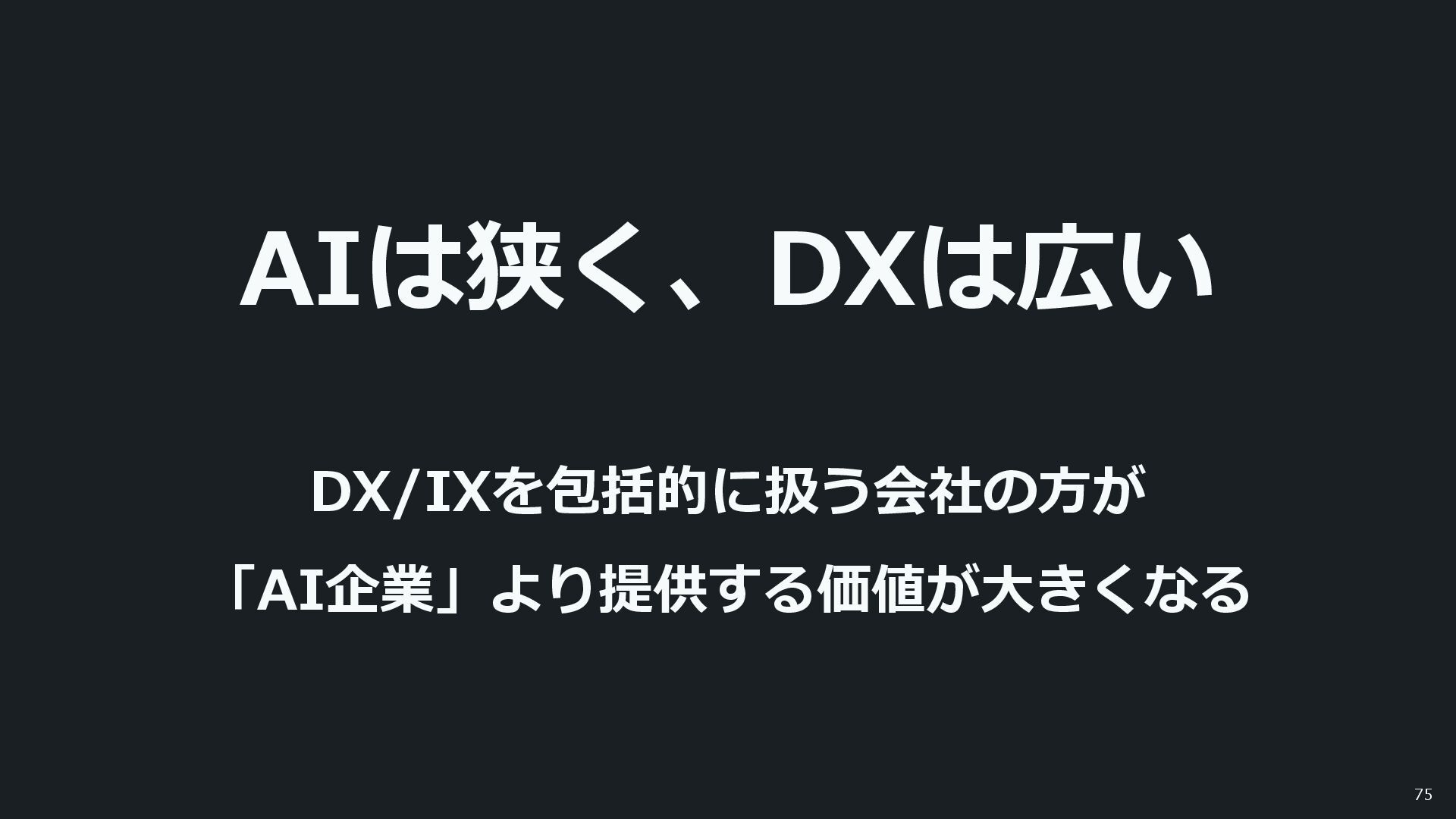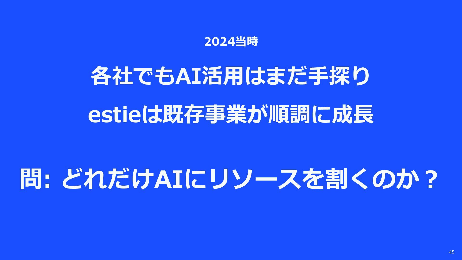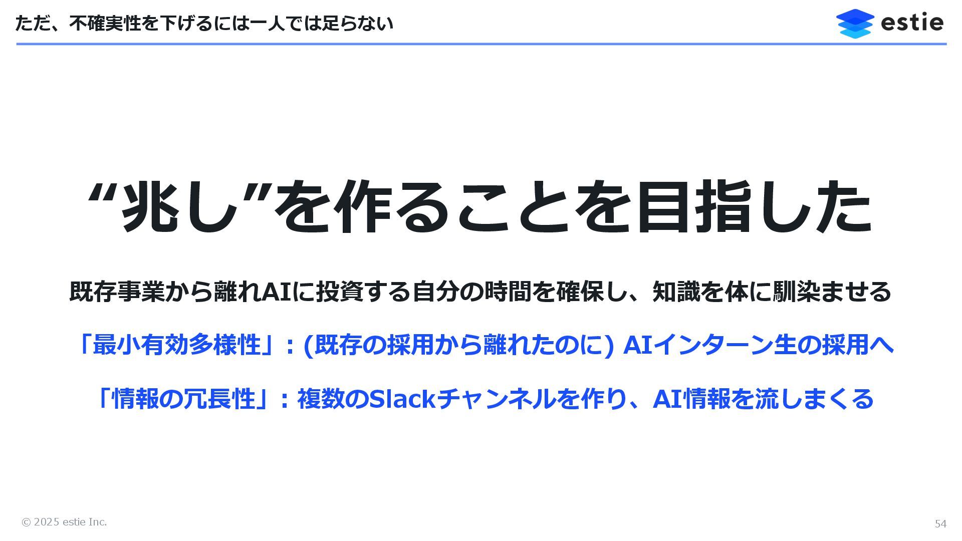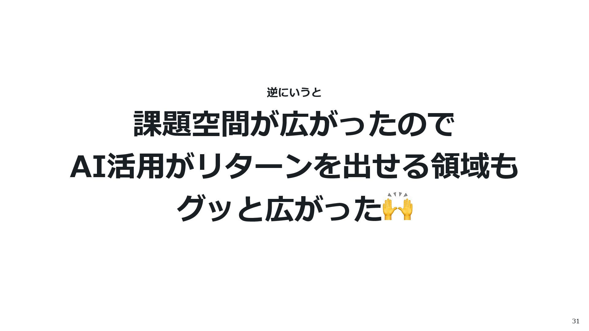 当初は焦りがあった…が、もう「全部賭けろ」はしなくてもいい 「早く成果を出さないと…」という気持ちがあった AIがない世界には我々はもう戻れない ーーー 腰を据えて取り組もう