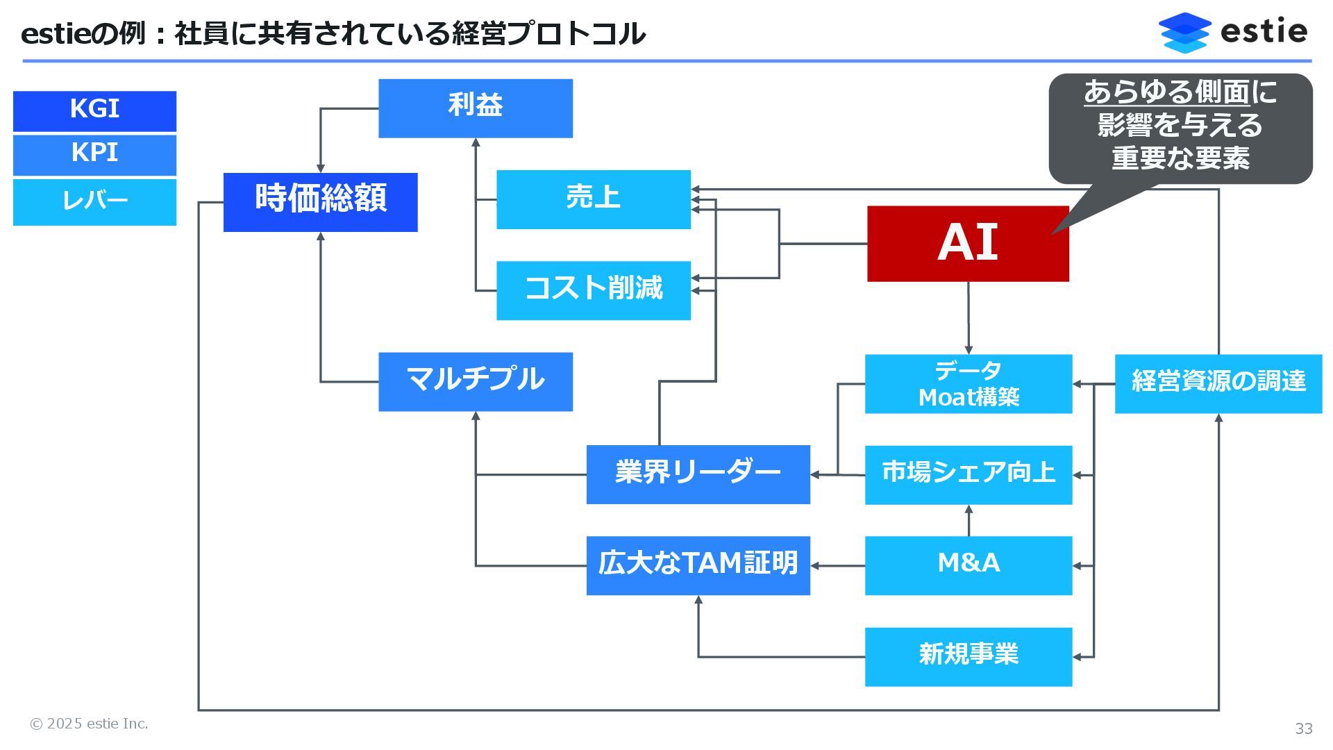 コスト削減 時価総額 売上 経営資源の調達 市場シェア向上 M&A マルチプル 利益 新規事業 AI KPI KGI レバー あらゆる側⾯に 影響を与える 重要な要素