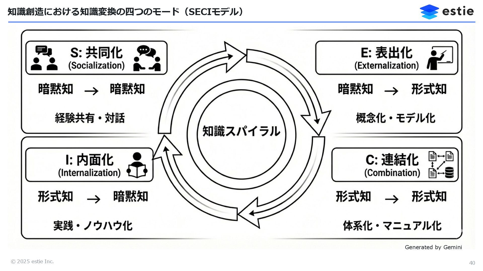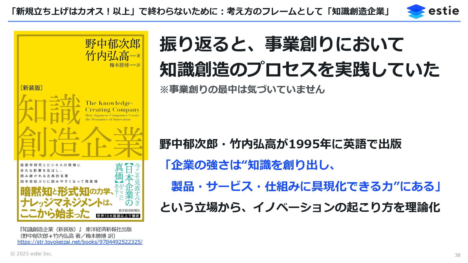 8. © 2025 estie Inc. 「新規⽴ち上げはカオス︕以上」で終わらないために︓考え⽅のフレームとして「知識創造企業」 38 振り返ると、事業創りにおいて 知識創造のプロセスを実践していた ※事業創りの最中は気づいていません 野中郁次郎・⽵内弘⾼が1995年に英語で出版