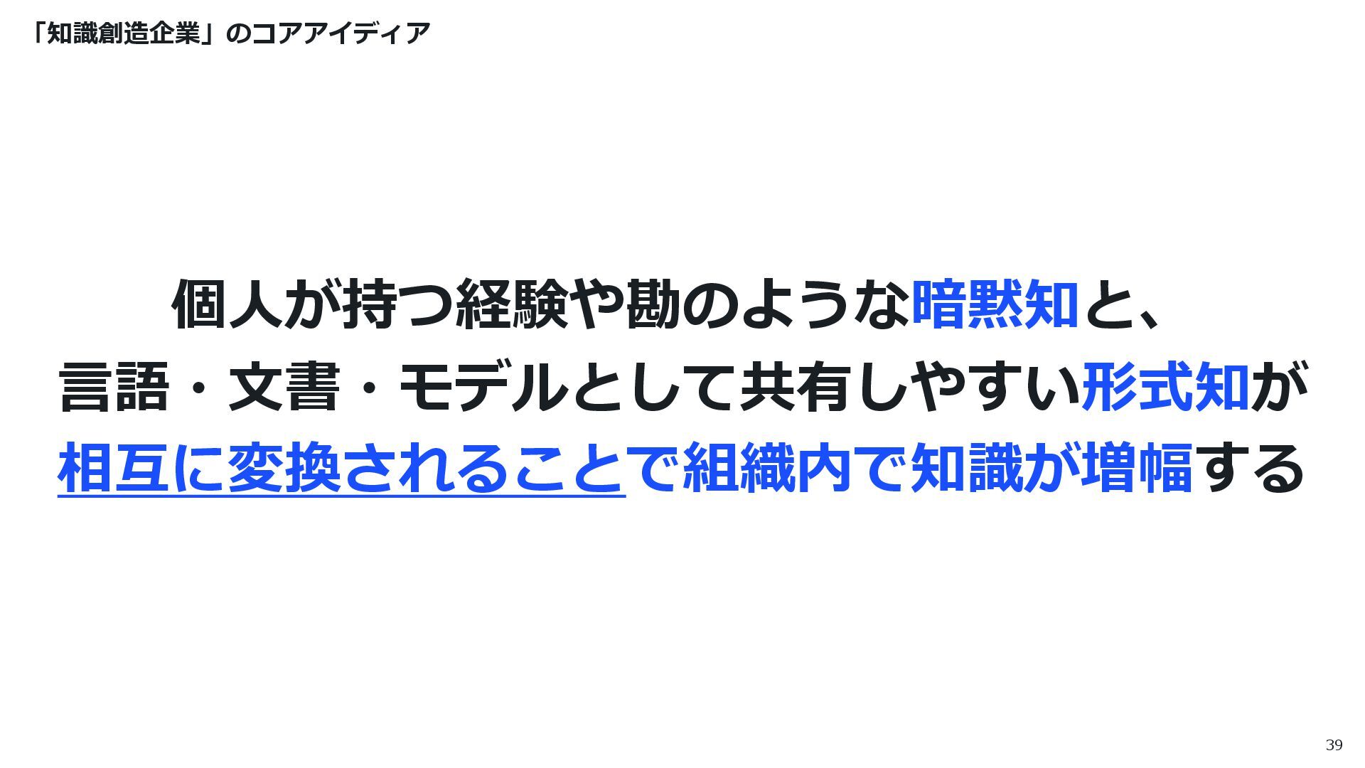 「企業の強さは“知識を創り出し、 製品・サービス・仕組みに具現化できる⼒”にある」 という⽴場から、イノベーションの起こり⽅を理論化 『知識創造企業(新装版)』 東洋経済新報社出版 (野中郁次郎+⽵内弘⾼ 著/梅本勝博 訳) https://str.toyokeizai.net/books/9784492522325/