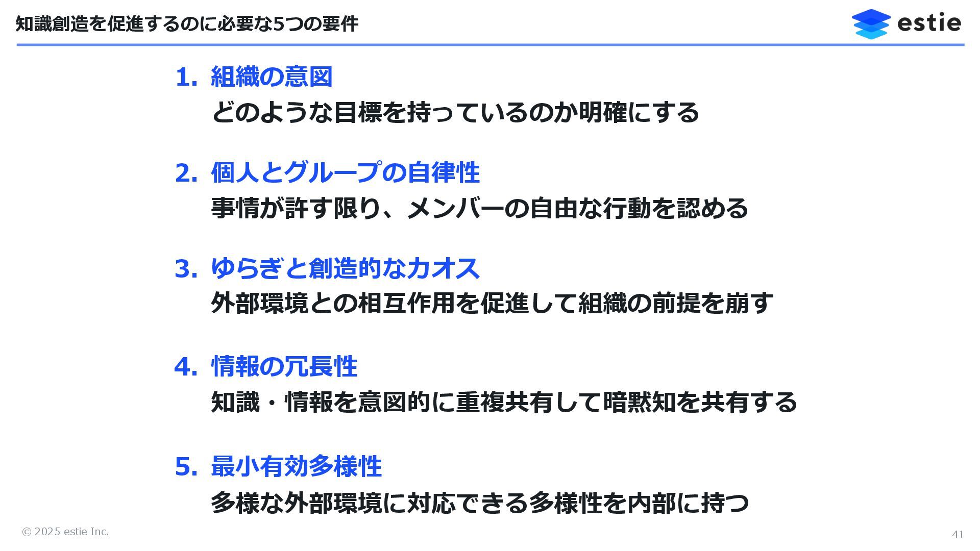 3. ゆらぎと創造的なカオス 外部環境との相互作⽤を促進して組織の前提を崩す 4. 情報の冗⻑性 知識・情報を意図的に重複共有して暗黙知を共有する 5. 最⼩有効多様性 多様な外部環境に対応できる多様性を内部に持つ 知識創造を促進するのに必要な5つの要件 41