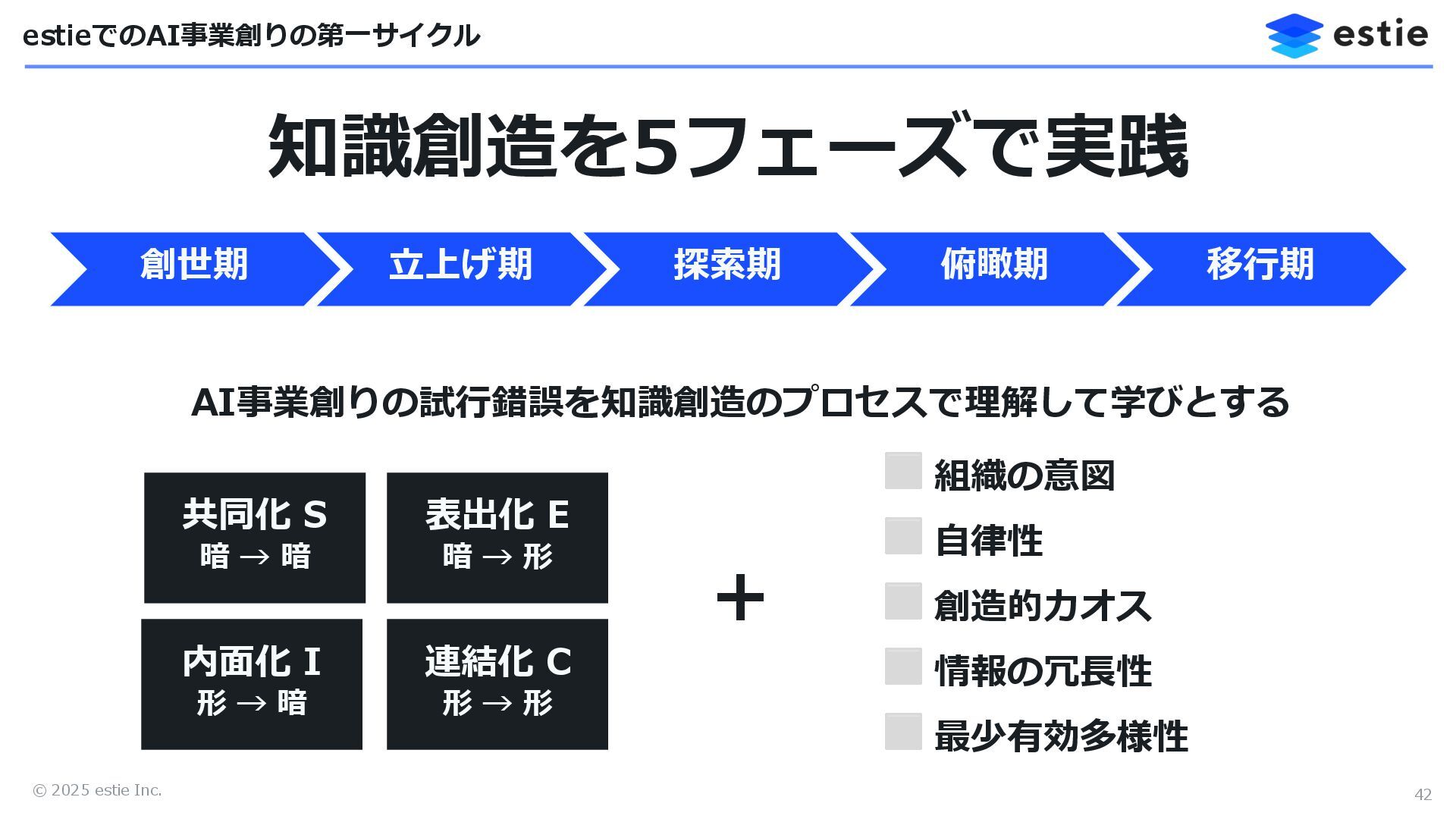 10. © 2025 estie Inc. estieでのAI事業創りの第⼀サイクル 42 知識創造を5フェーズで実践 創世期 ⽴上げ期 探索期