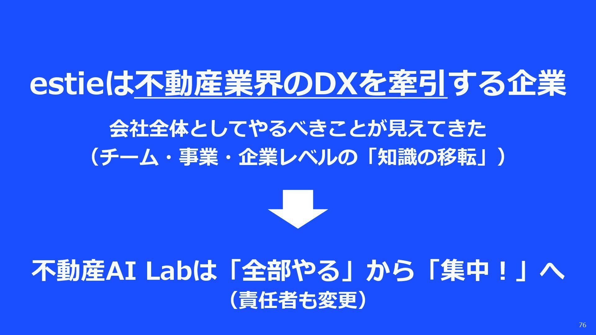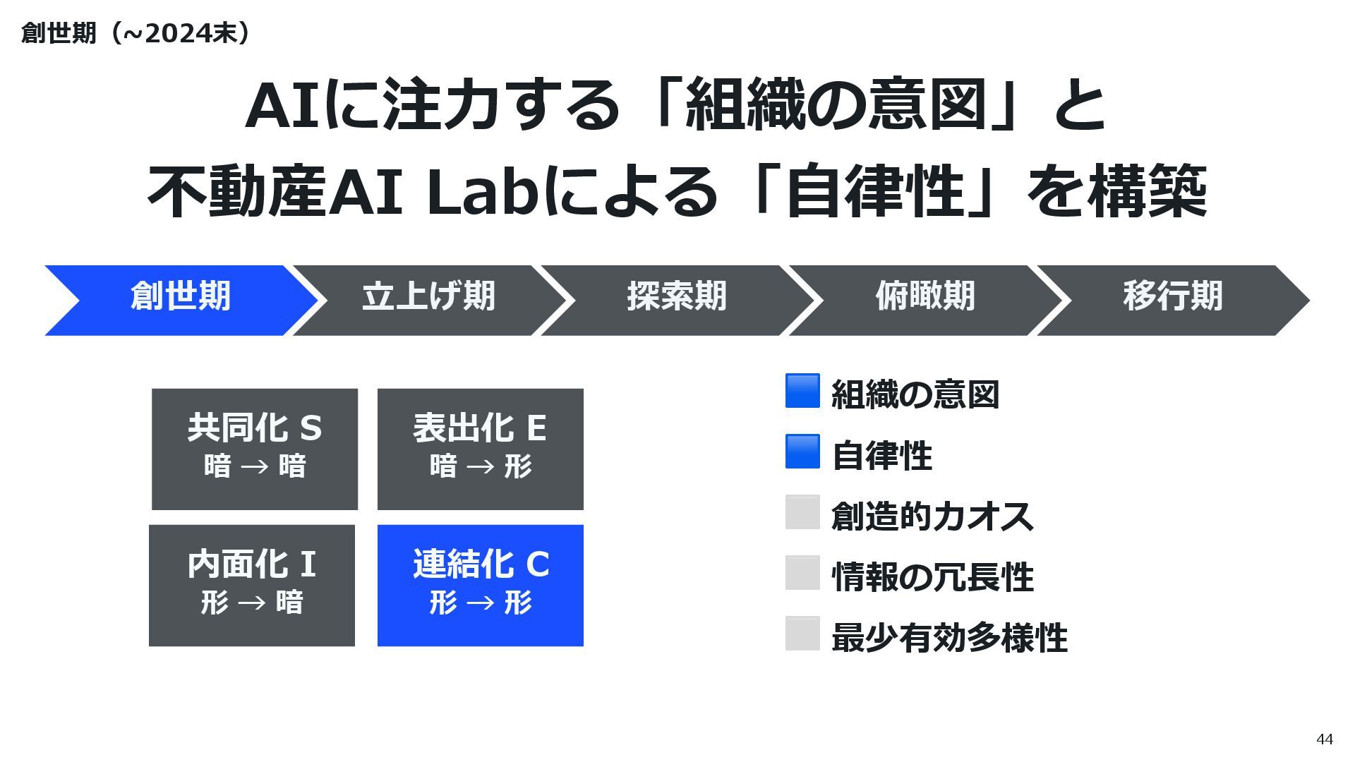 移⾏期 🟦 組織の意図 🟦 ⾃律性 ⬜ 創造的カオス ⬜ 情報の冗⻑性 ⬜ 最少有効多様性 AIに注⼒する「組織の意図」と 不動産AI Labによる「⾃律性」を構築 共同化 S 暗 → 暗 表出化 E 暗 → 形 内⾯化 I 形 → 暗 連結化 C 形 → 形