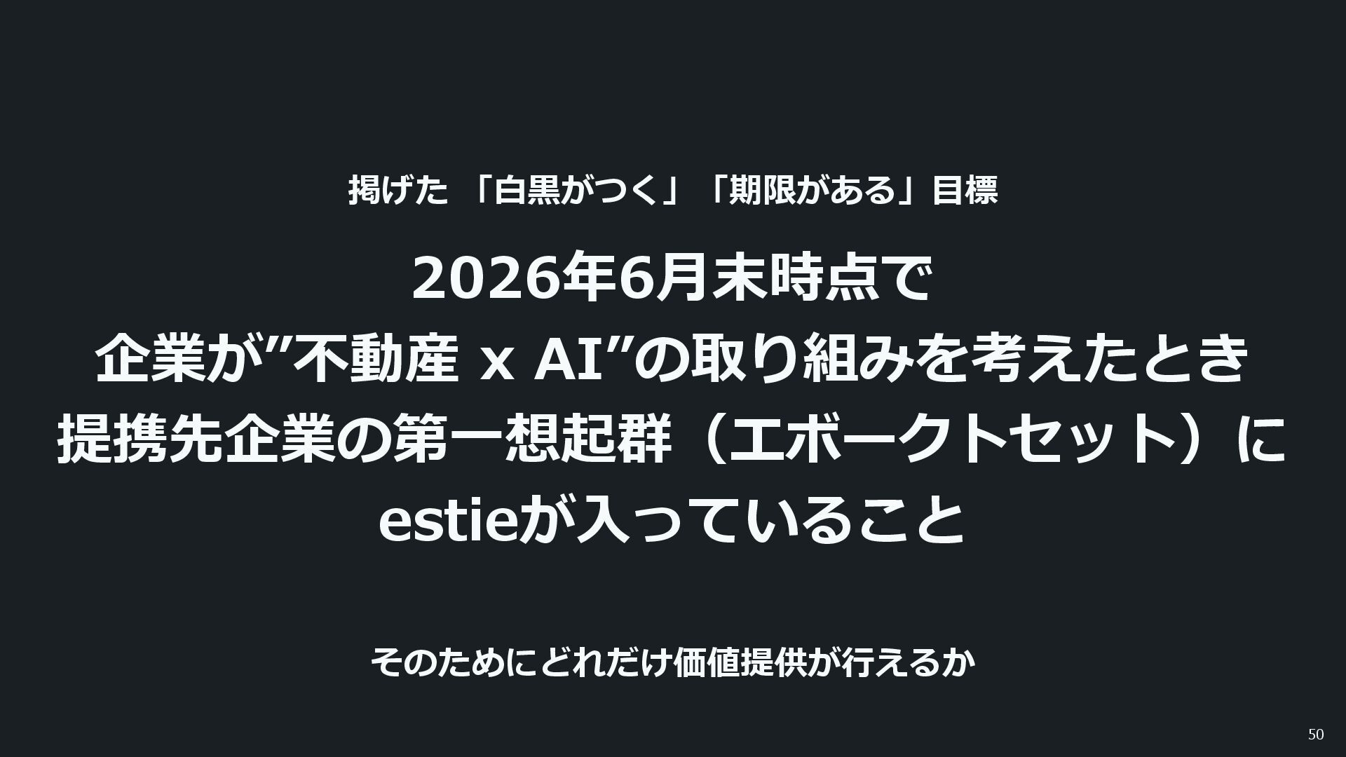 estieが⼊っていること 掲げた 「⽩⿊がつく」「期限がある」⽬標 そのためにどれだけ価値提供が⾏えるか