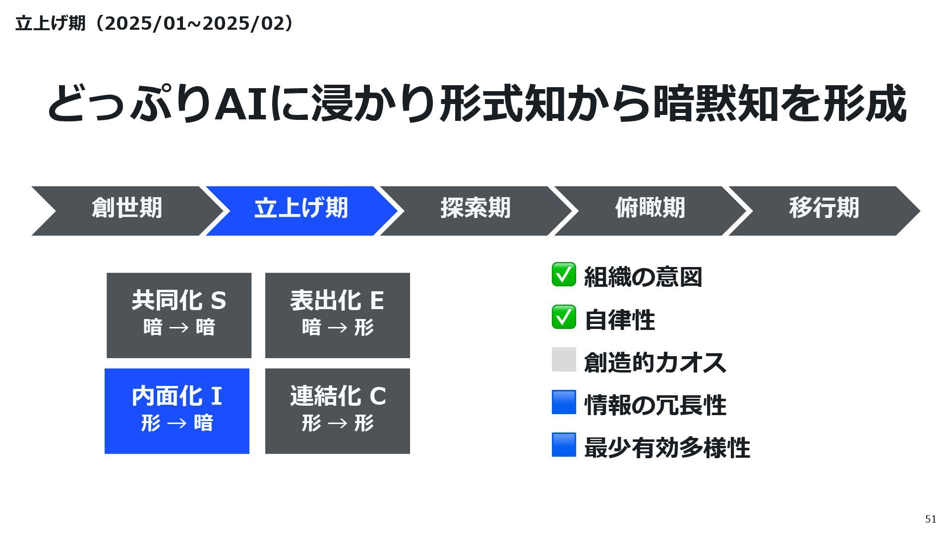 移⾏期 どっぷりAIに浸かり形式知から暗黙知を形成 共同化 S 暗 → 暗 表出化 E 暗 → 形 内⾯化 I 形 → 暗 連結化 C 形 → 形 ✅ 組織の意図 ✅ ⾃律性 ⬜ 創造的カオス 🟦 情報の冗⻑性 🟦 最少有効多様性