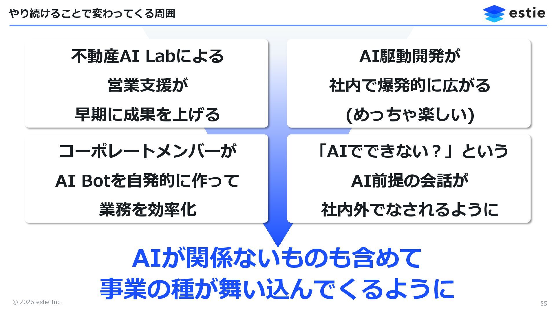 16. © 2025 estie Inc. やり続けることで変わってくる周囲 55 「AIでできない︖」という AI前提の会話が 社内外でなされるように コーポレートメンバーが
