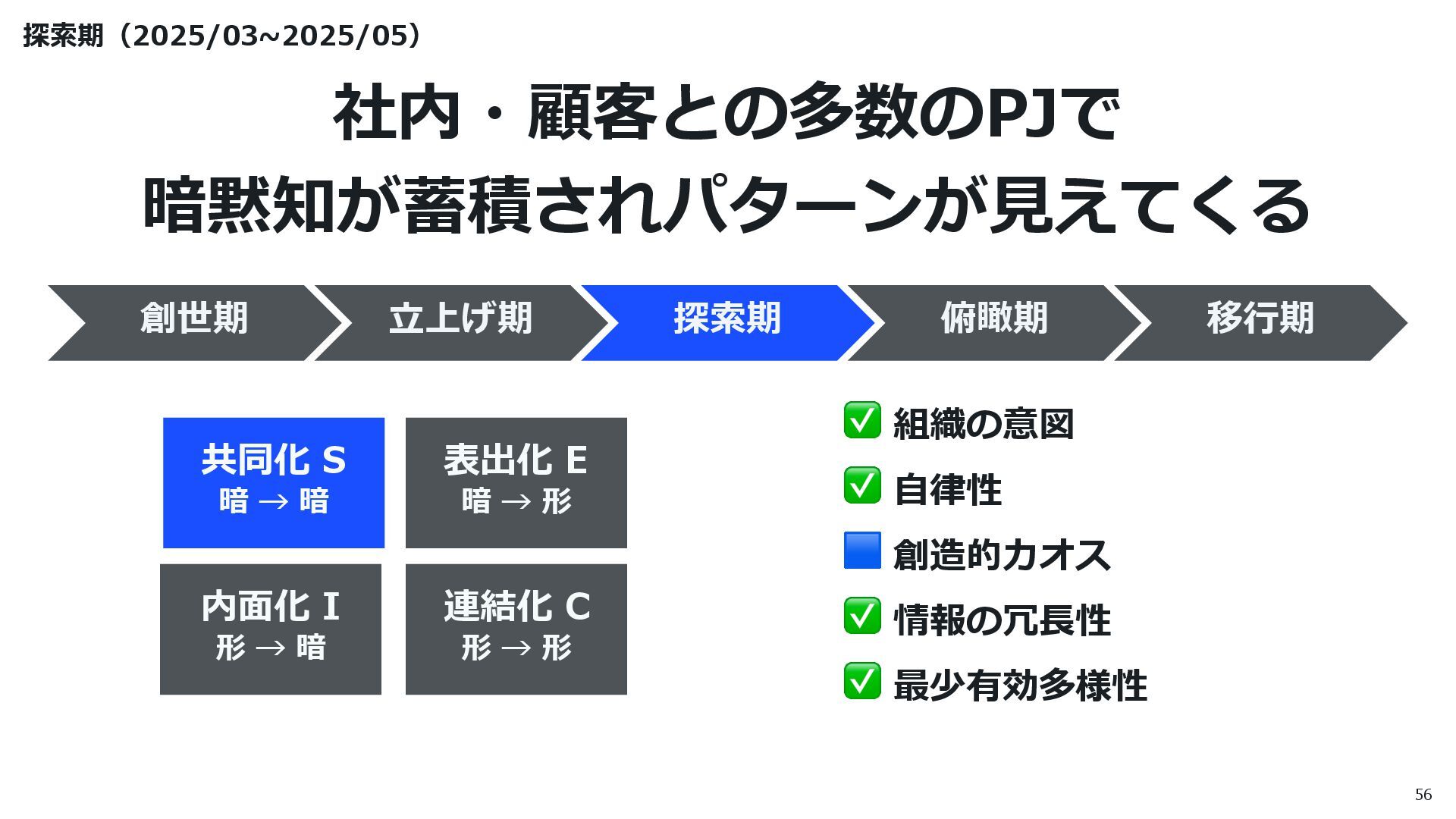 移⾏期 社内・顧客との多数のPJで 暗黙知が蓄積されパターンが⾒えてくる 共同化 S 暗 → 暗 表出化 E 暗 → 形 内⾯化 I 形 → 暗 連結化 C 形 → 形 ✅ 組織の意図 ✅ ⾃律性 🟦 創造的カオス ✅ 情報の冗⻑性 ✅ 最少有効多様性