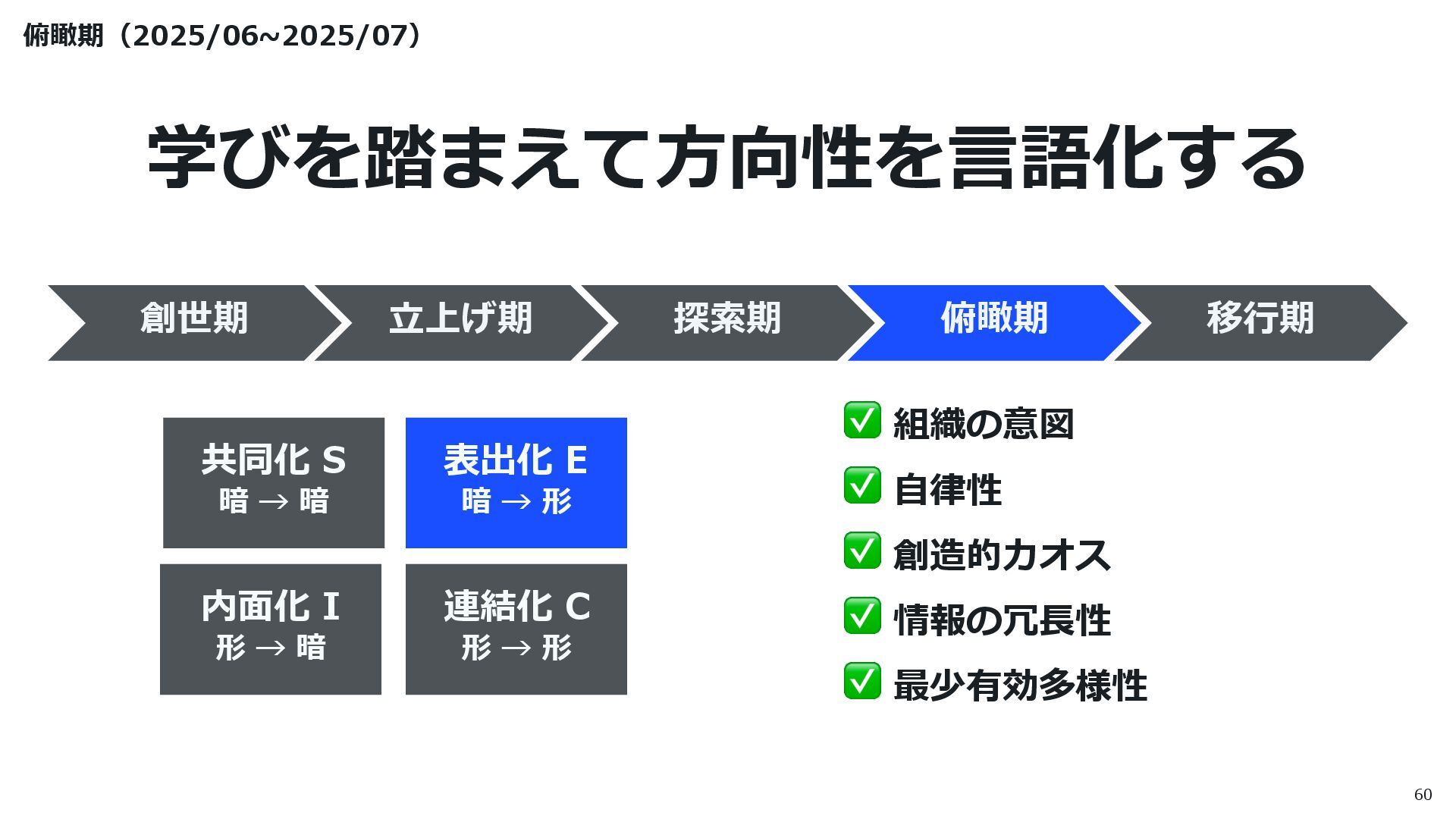 移⾏期 学びを踏まえて⽅向性を⾔語化する 共同化 S 暗 → 暗 表出化 E 暗 → 形 内⾯化 I 形 → 暗 連結化 C 形 → 形 ✅ 組織の意図 ✅ ⾃律性 ✅ 創造的カオス ✅ 情報の冗⻑性 ✅ 最少有効多様性