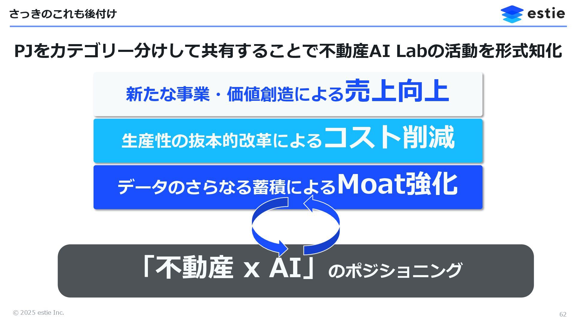 19. © 2025 estie Inc. さっきのこれも後付け 62 PJをカテゴリー分けして共有することで不動産AI Labの活動を形式知化 「不動産 x